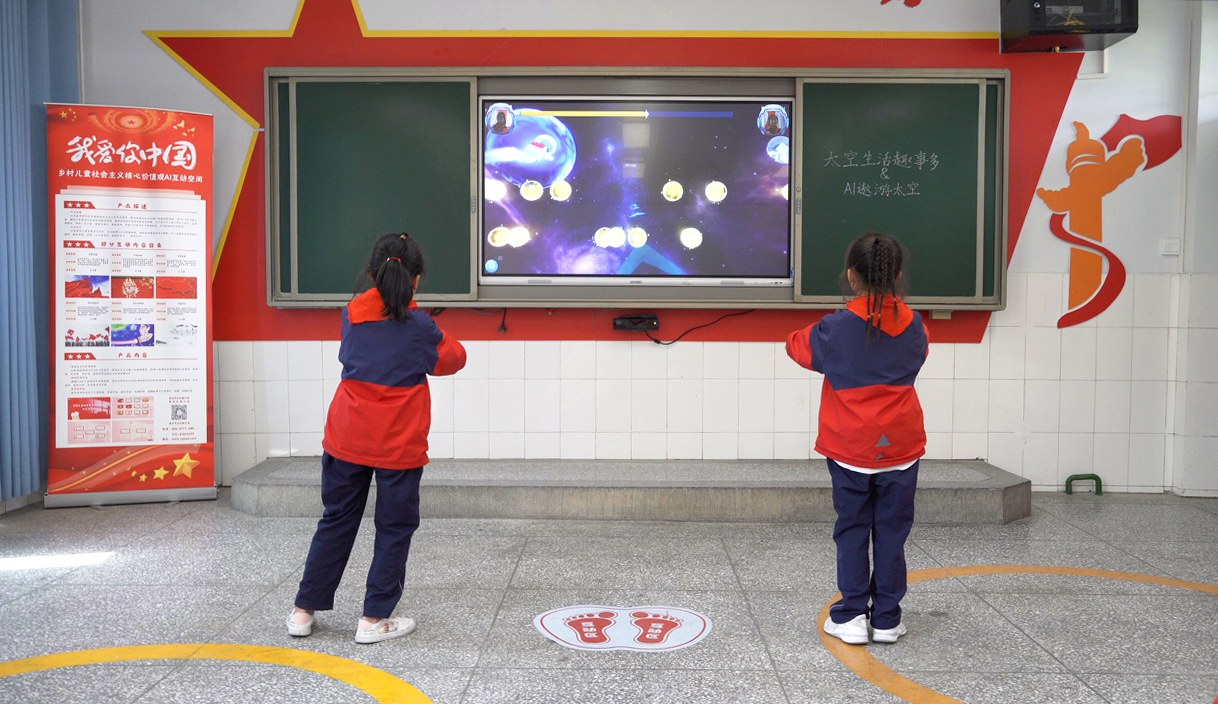 云阳县栖霞小学学生在“小扣子”AI互动空间“遨游太空”。图/王柏林