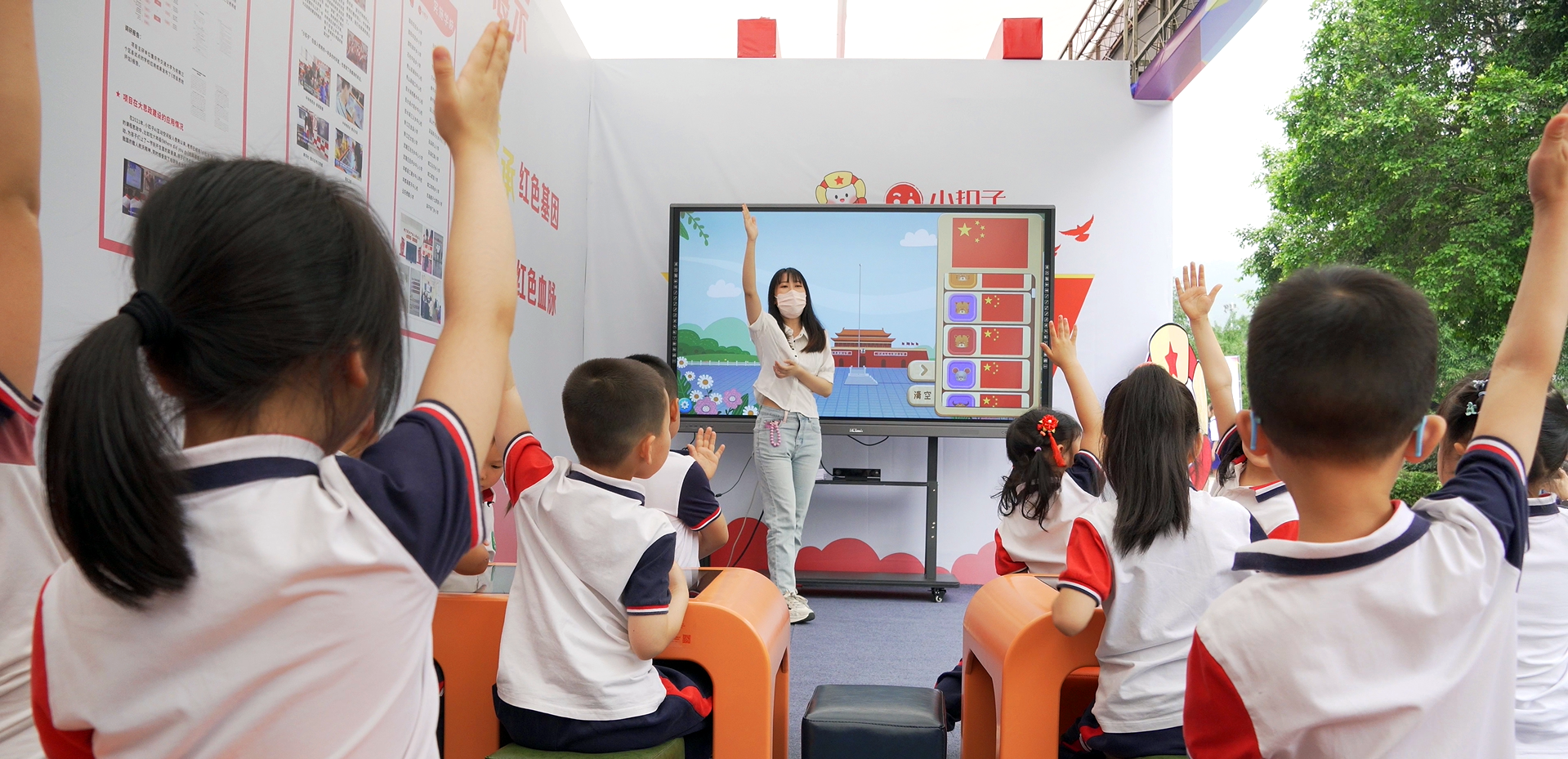 当课堂接近尾声,国歌奏响,同学们望着屏幕上冉冉升起的五星红旗,一双双小手向上高高举起,向国旗致以崇高的敬礼。