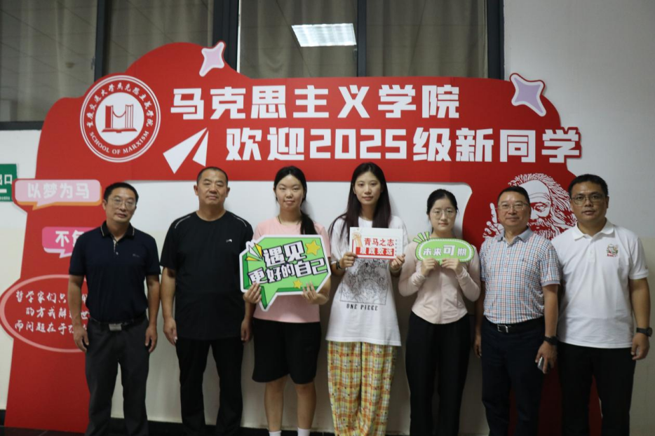 特色打卡区同样亮眼,醒目红色背景板印着“马克思主义学院欢迎2025级新同学”,点缀着“以梦为马”等励志话语与哲学文字。新生手持“遇见更好的自己”“青马之志 履践致远”等手牌纷纷在此合影,定格下初入校园的期待与憧憬。
