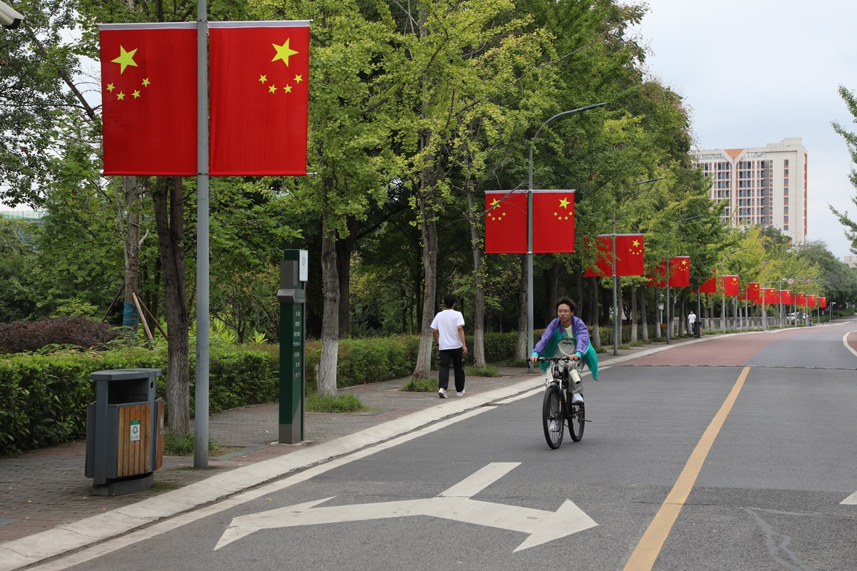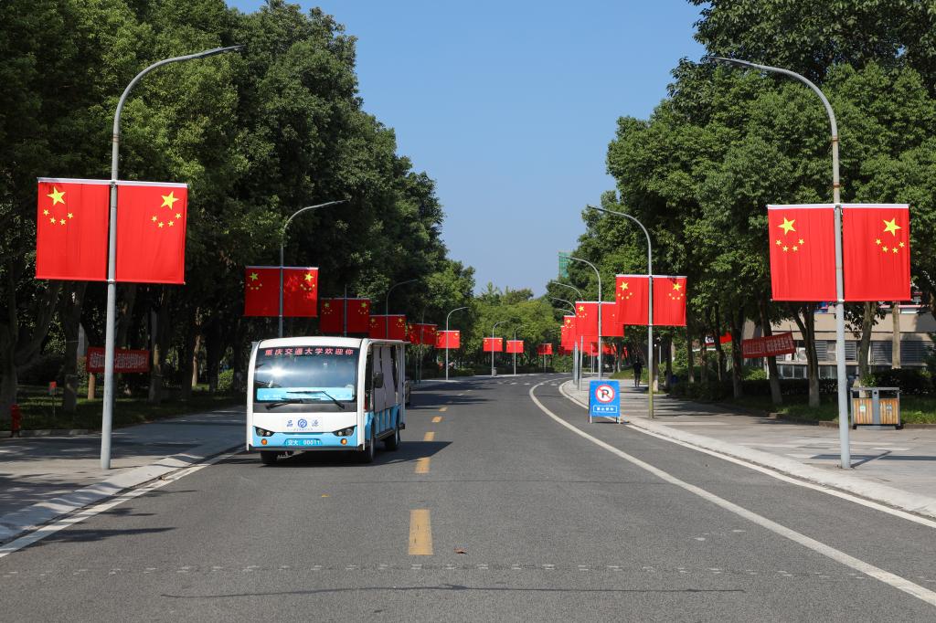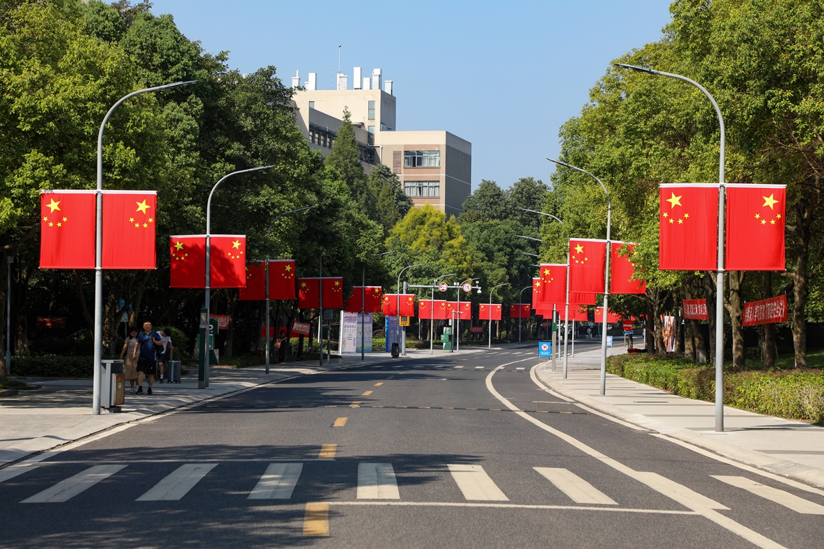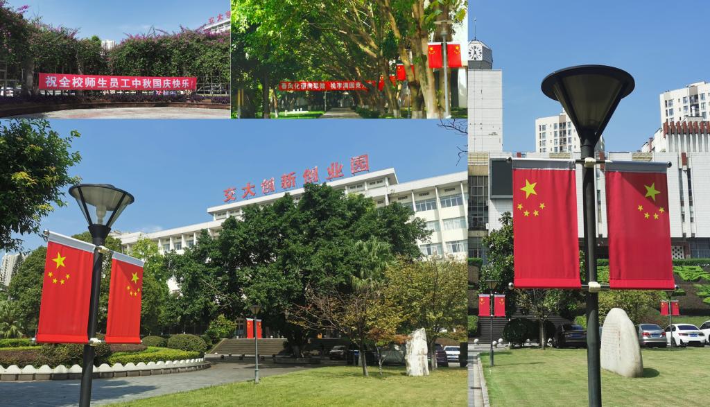 在科学城校区,现代化建筑与开阔的广场在五星红旗的装点下,更显蓬勃朝气——国旗与蓝天、白云、绿树以及温暖的阳光,共同构成了节日里最美丽的风景。