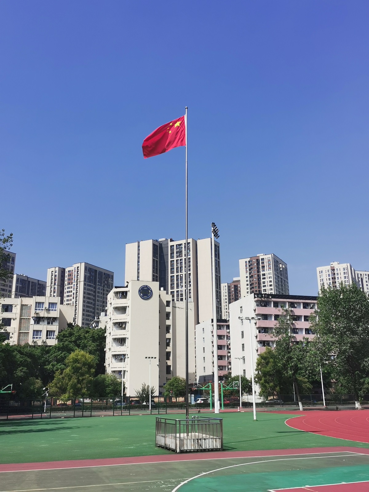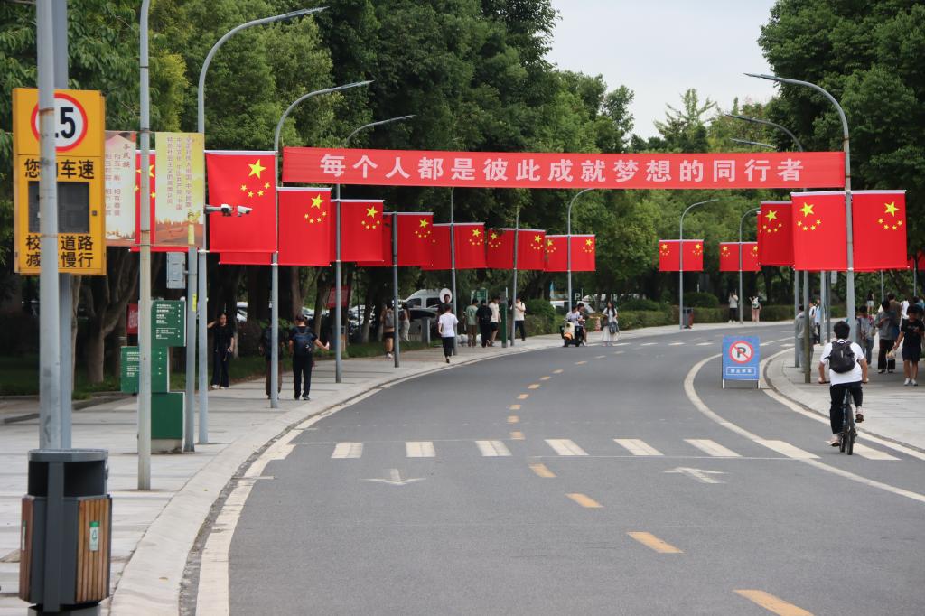 从进入校门的主干道开始,一面面五星红旗沿路延伸,形成壮观的红色长廊。