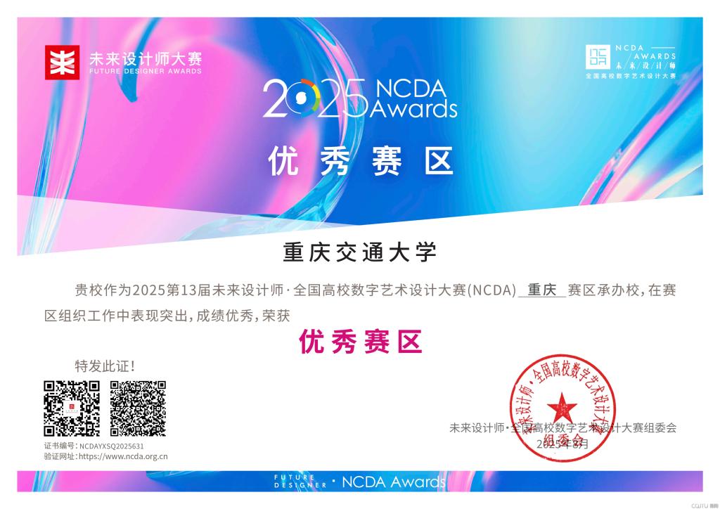 此外,2025第13届未来设计师·全国高校数字艺术设计大赛(NCDA)全国总决赛近日落幕。重庆赛区凭借在全国赛事组织中的卓越表现,荣获大赛组委会颁发“优秀赛区”。重庆交通大学作为连续五届重庆赛区承办单位,以专业高效的组织能力、广泛的高校参与度及丰硕的赛事成果,再次彰显了在推动区域设计教育创新与人才培养中的引领作用。