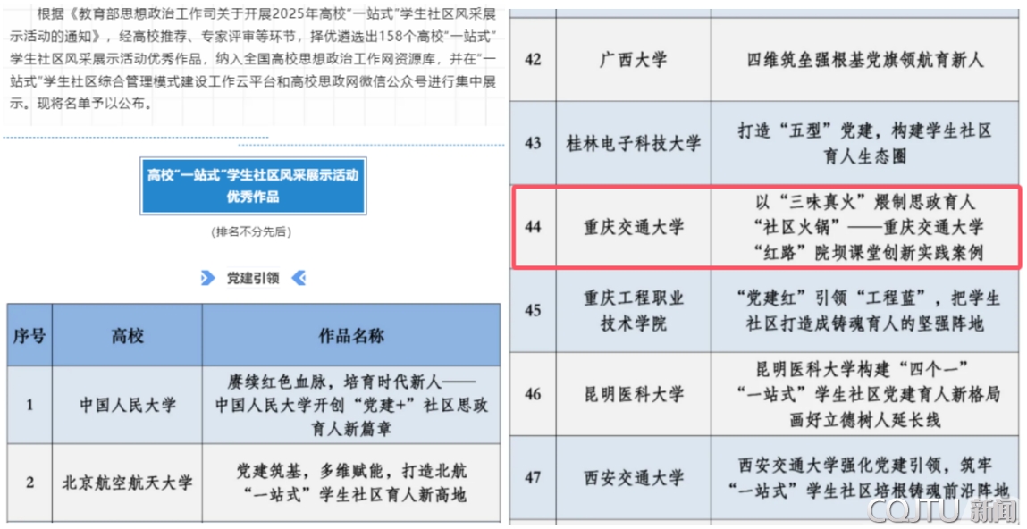 9月,教育部思想政治工作司公布了2025年高校“一站式”学生社区风采展示活动优秀作品名单,重庆交通大学《重庆交通大学以“三味真火”煨制思政育人“社区火锅”,打造“红路”院坝课堂》、《重庆交通大学创设“AI +创新实践基地”,赋能社区育人新场域》2项典型案例成功入选全国优秀作品。
