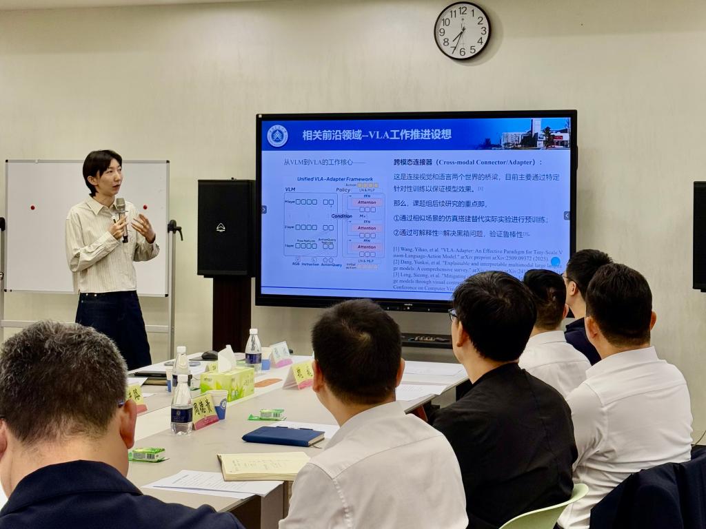 会上,航运与船舶工程学院青年学者张淋围绕“基于预训练大模型的机器人开放环境感知技术”展开交流。她系统梳理了视觉-语言-动作(VLA)模型的演进脉络,指出VLA通过融合大语言模型、视觉语言模型与模仿学习,已在封闭环境导航、机械臂操控等任务中取得突破,但在开放环境泛化、时空推理与可信决策方面仍存瓶颈。张淋展示团队在室内外导航避障模组、船舶水岸线识别及VLA机械臂部署中的阶段性成果,提出以“仿真预训练—可解释性—鲁棒性验证”为主线,构建跨模态连接器,打造无人船与水下机器人通用感知-规划-控制框架。下一步,她将联合西交利物浦大学、哈工大等单位共建共享仪器与数据,深化数据-机理协同驱动的高温、高湿、高盐复杂水域模型研究,并推进城市安全监测等民用场景落地,目标建成业界标杆的无人装备技术团队,支撑学院博士点建设与智能航运前沿探索。
