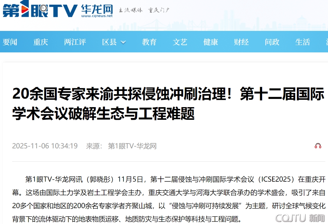 第1眼TV-华龙网讯(郭晓彤)11月5日,第十二届侵蚀与冲刷国际学术会议(ICSE2025)在重庆开幕。这场由国际土力学及岩土工程学会主办,重庆交通大学与河海大学联合承办的学术盛会,吸引了来自20多个国家和地区的200余名专家学者齐聚山城,以“侵蚀与冲刷可持续发展”为主题,研讨全球气候变化背景下的流体驱动下的地表物质运移、地质防灾与生态保护等科技与工程问题。