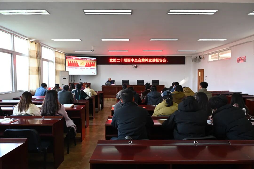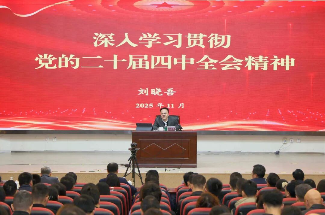 为深入学习宣传贯彻党的二十届四中全会精神,进一步统一思想、凝聚共识、明确方向,11月13日下午,学校举行党委理论学习中心组2025年第8次集体(扩大)学习会暨党的二十届四中全会精神宣讲报告会,校党委书记张俊作专题宣讲,学校全体中层干部、机关党总支全体党员到会学习。