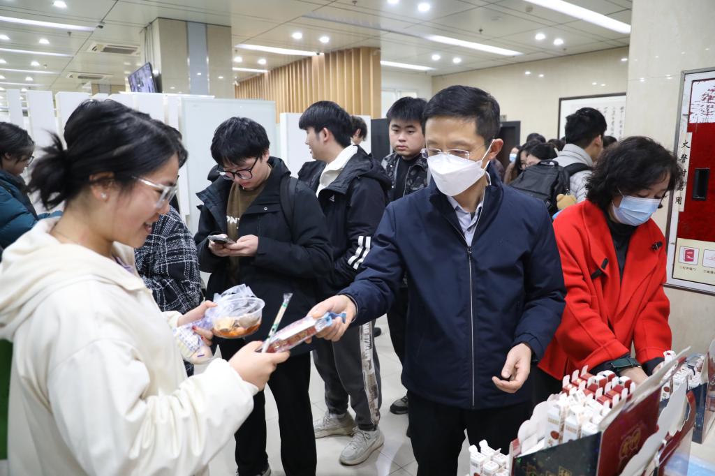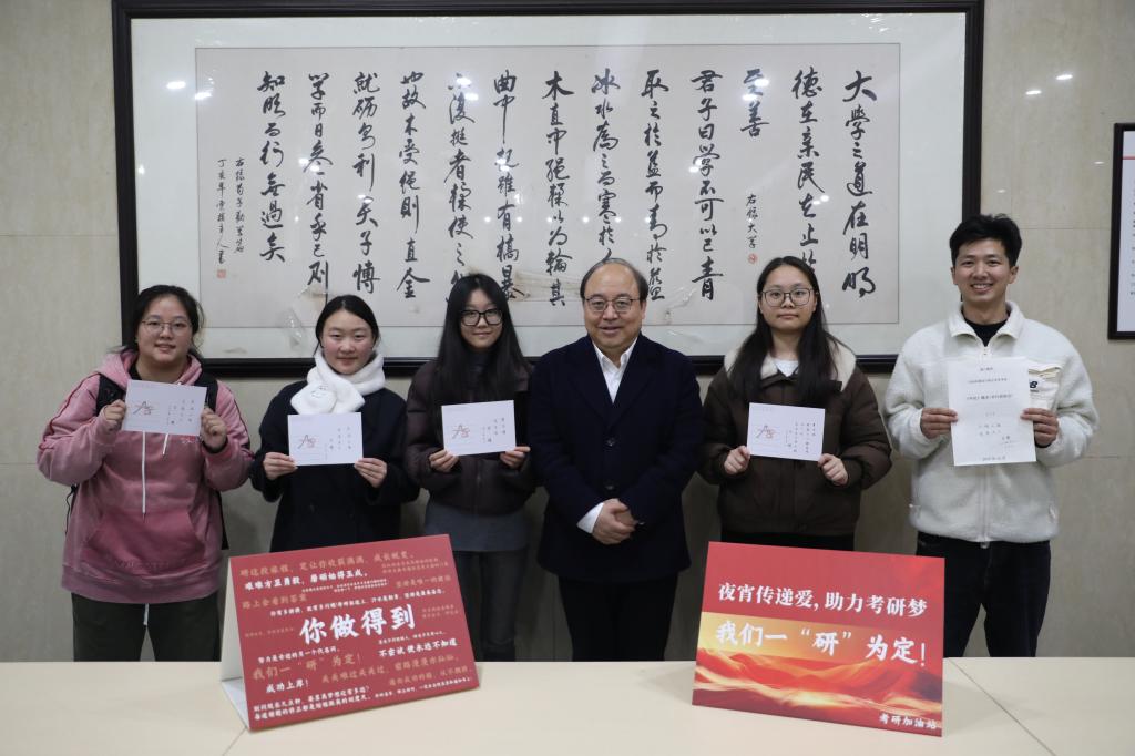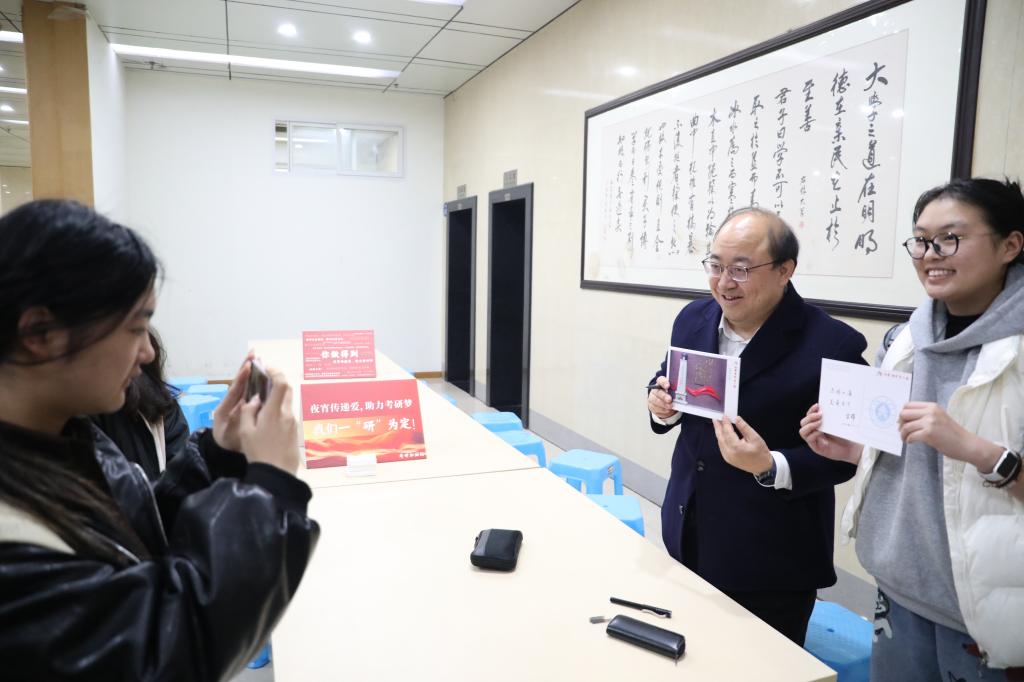 “复习得怎么样了?”“报考的哪所高校呀?”“生活学习上还有什么困难吗?”学校党委书记宫辉老师带着对考研学子的牵挂,连续多个夜晚来到现场,亲切地与同学们交谈,关心他们的复习进度和心理状态,并在祝福卡片上一笔一划地写下对他们的美好祝愿。宫辉还来到各服务点,详细了解活动安排和物资发放情况,向义务服务的教职工表示感谢。