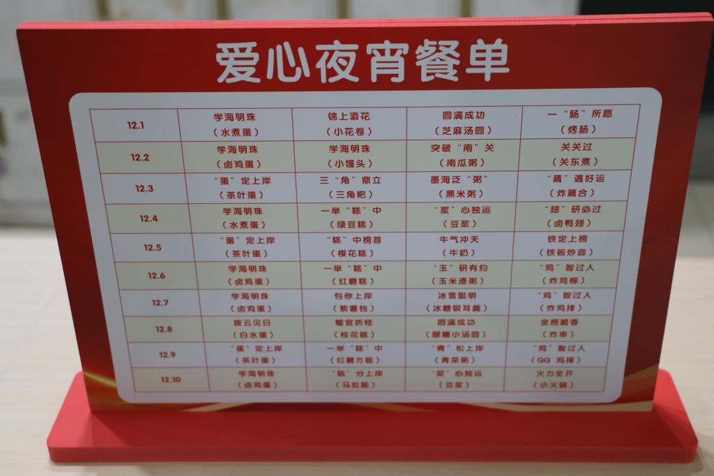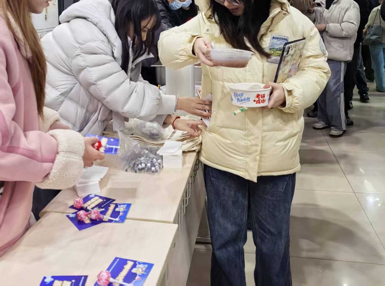 每晚22:30至23:00,在双校区四个指定活动点,不仅有为同学们补充能量的各类夜宵,各党支部更是“绞尽脑汁”,准备了花样繁多的加油礼包和咨询帮扶。除文具、励志卡片和实用的暖手宝外,旺旺牛奶、棒棒糖等寓意美好的零食备受青睐,让同学们在考研前夕多了一份温暖与安心。
