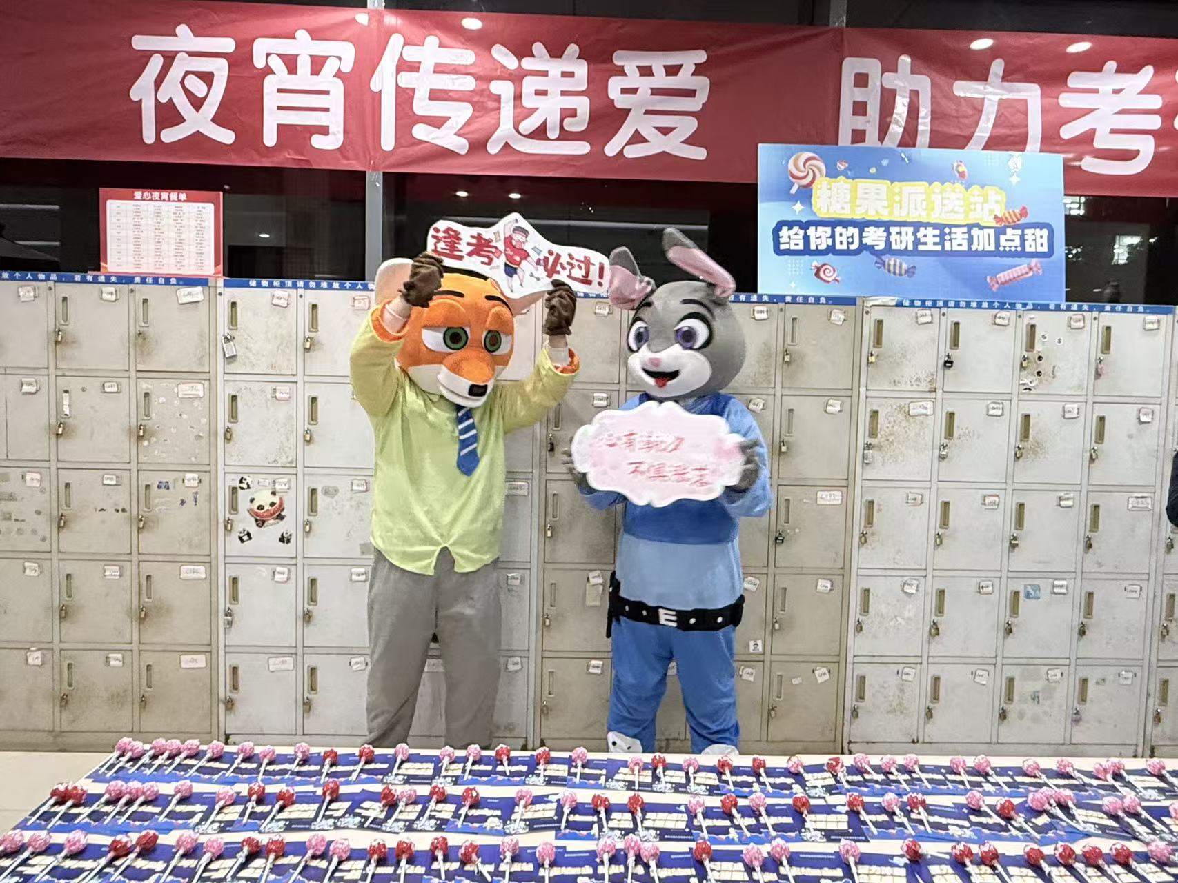 现场,一些支部创意服务更成为了同学们关注的焦点。有的支部设立了考研英语咨询点,由专业教师为学子们答疑解惑,帮助他们明晰未来规划。令人惊喜的是,老师们还装扮成《疯狂动物城》中的经典角色,憨态可掬的“朱迪”和“尼克”与同学们拥抱、击掌、合影,用快乐驱散着备考的紧张氛围。