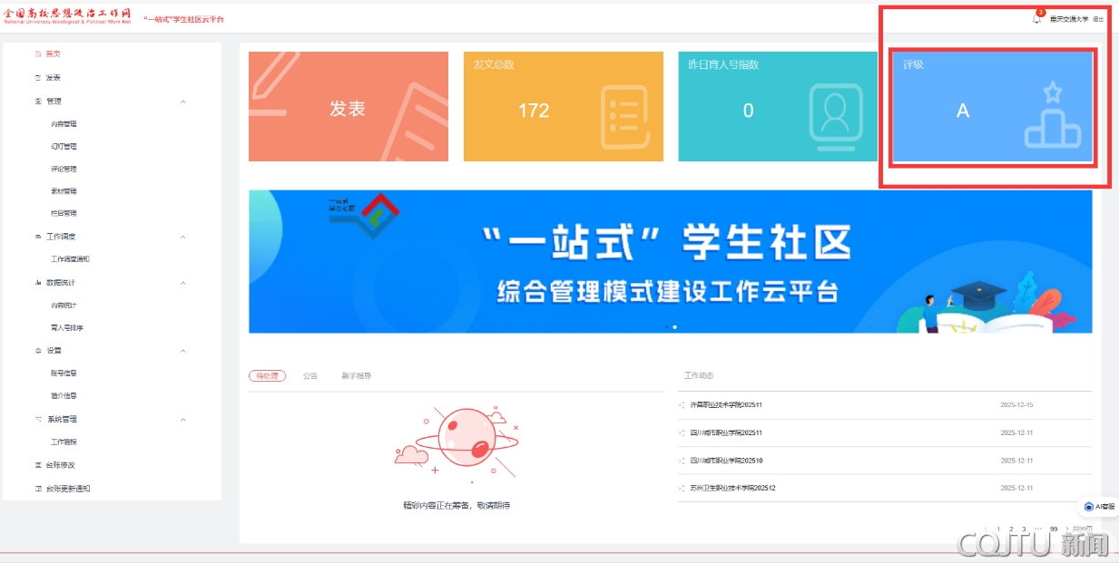 近日,教育部全国思想政治工作网公布2025年高校“一站式”学生社区综合管理模式评级结果,重庆交通大学凭借扎实的建设成效、丰硕的实践成果,逐步实现从C级到B级又晋升为A级的跨越,跻身全国普通高等院校前15%行列。