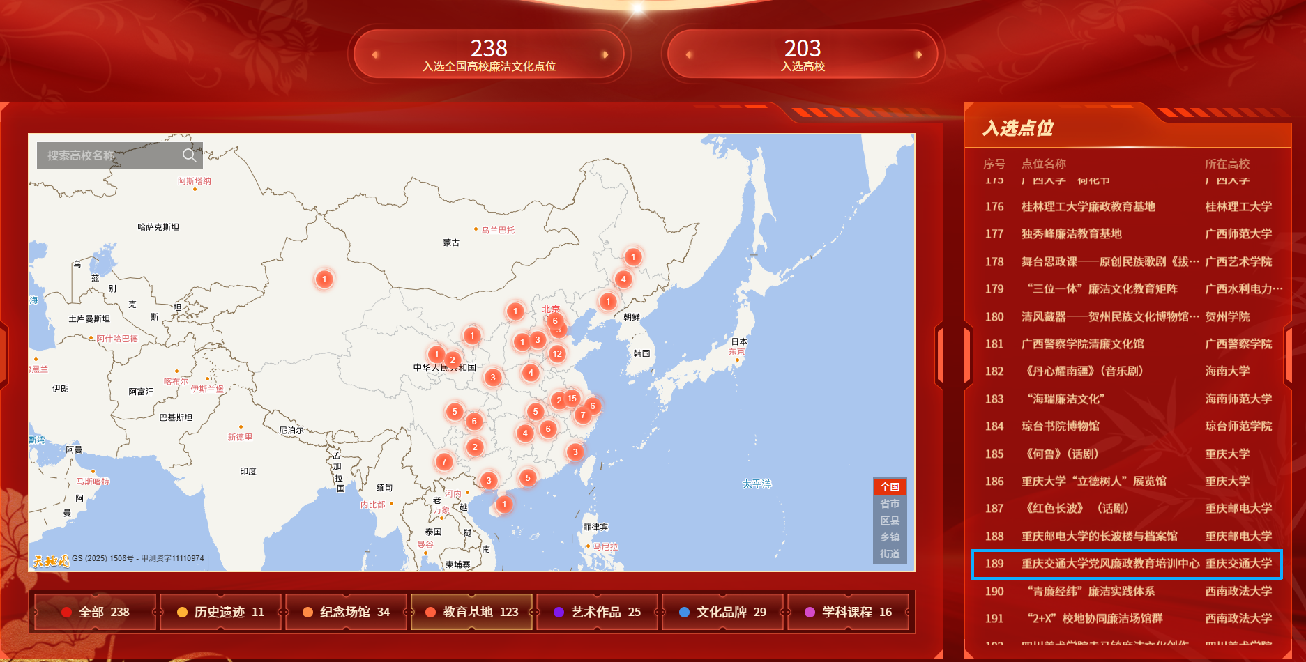 近日,全国高校思想政治工作网正式公布教育部第十届高校廉洁教育系列活动“传廉促担当”廉洁文化地图素材征集成果,重庆交通大学党风廉政教育培训中心凭借鲜明的教育特色与扎实的建设成效,成功入选“全国高校廉洁文化地图”。此次征集活动聚焦廉洁文化传播与育人实效,面向全国高校开展,通过搭建覆盖全国的可视化、可感知廉洁教育资源平台,为高校党员干部、广大师生及社会公众打造沉浸式廉洁文化体验载体,最终共有203 所高校的 238 个优质廉洁文化点位脱颖而出。作为重庆高校廉洁文化建设的标杆阵地,我校党风廉政教育培训中心的成功入选既是对学校新时代廉洁文化建设工作的充分认可,也为下一步工作的持续深入注入了强劲动力。