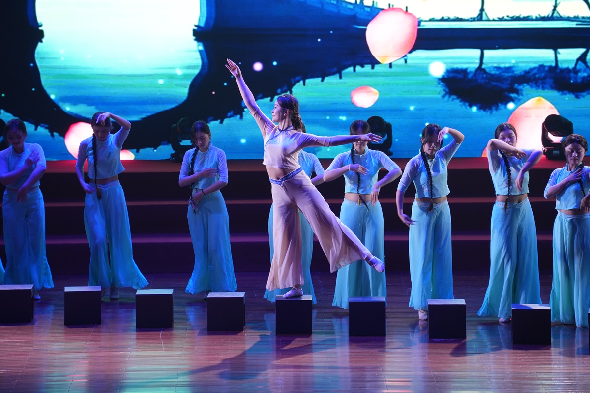 随后,大学生艺术团演唱歌曲《那些喊给天空的》,旋律舒缓,舞台营造出云海般的诗意氛围。晚会在爵士舞《万象盛典》中落下帷幕,动感舞步与绚丽灯光交相辉映,将现场气氛推向高潮。