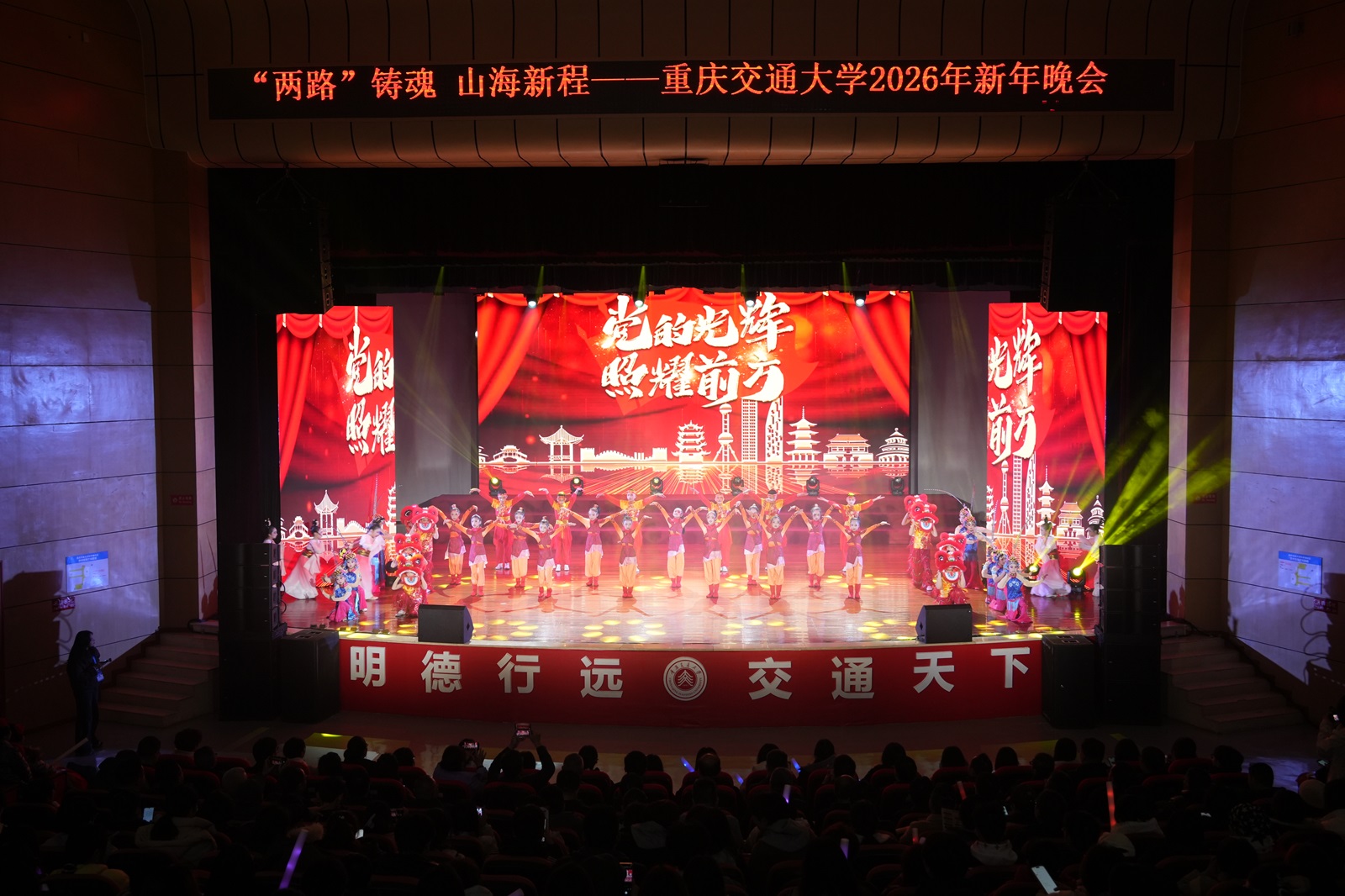 灯光璀璨,歌舞飞扬,校园洋溢着辞旧迎新的喜庆氛围。12月30日晚,“‘两路’铸魂,山海新程”2026年新年晚会在重庆交通大学科学城校区学生活动中心学术报告厅举行。校党委书记宫辉,校长赖远明,党委副书记张铭,党委常委、副校长杨胜发,副校长郑丹,党委常委、副校长罗均,党委常委、党政办主任杨既福出席晚会。各学院主要负责人及师生代表700余人齐聚一堂,在辞旧迎新的时刻,共同回望精神来路,开启奋进新程。