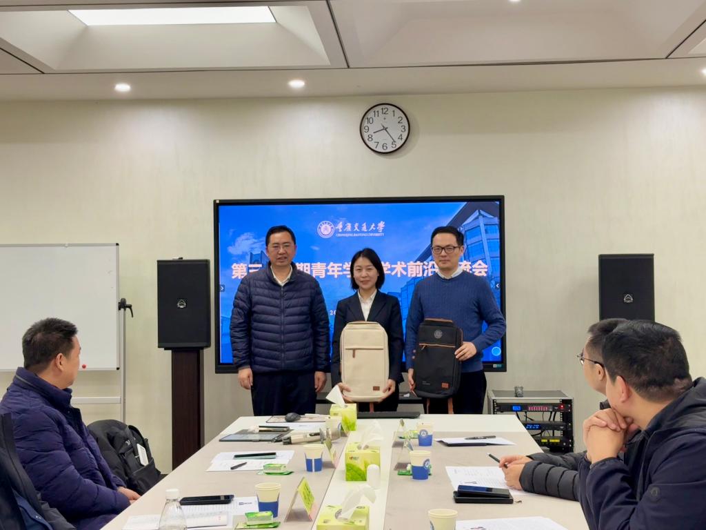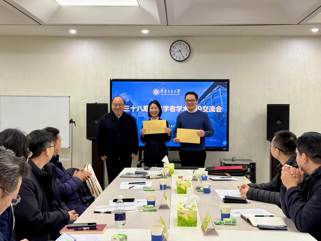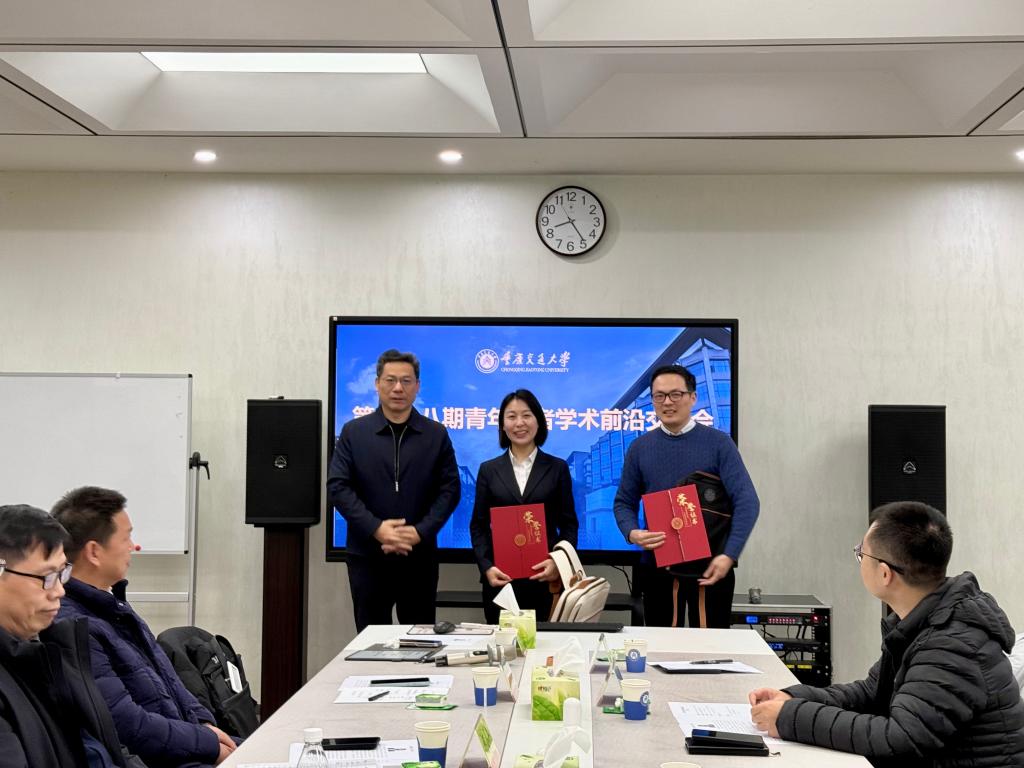 会后,宫辉书记向两位青年学者赠送了嵌有其名字的藏头诗以表勉励,罗均副校长、任海涛部长分别为两位学者颁发荣誉证书及重庆交通大学文创书包,以此感谢他们为本次交流会带来的精彩报告与前沿分享。