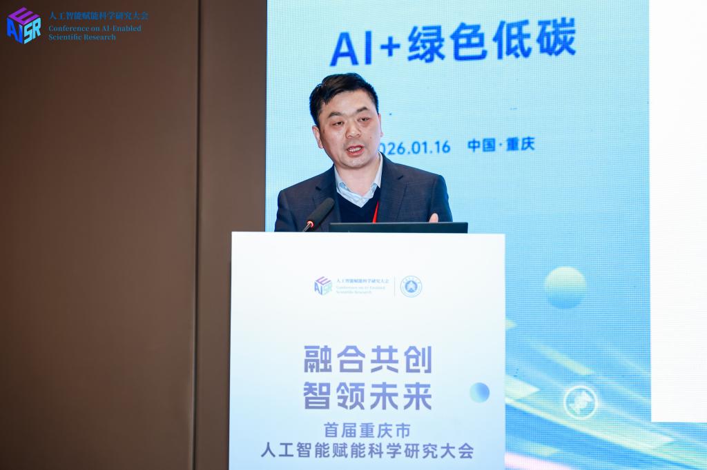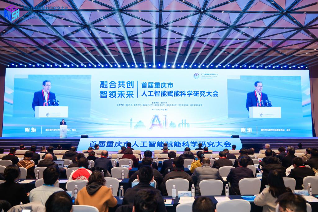 1月16日,重庆市首届“人工智能赋能科学研究”大会在中国重庆·科学会堂举行。大会以“人工智能赋能科学研究”为主题,聚焦人工智能推动科研范式变革与创新能力提升,旨在汇聚政产学研力量,推动科研与战略需求更深度融合。重庆市政府副市长、西部科学城重庆高新区党工委书记马震出席大会并致辞,多名院士专家以及全市17所高校、25家科研机构及40家重点企业代表共同参会。重庆交通大学深度参与大会组织与学术交流,并承办当日下午举行的“AI+绿色低碳”论坛。