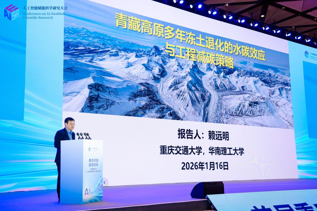 当天上午,大会开幕式隆重举行。与会院士专家围绕人工智能与科学研究深度融合的时代背景、发展趋势和实践方向展开交流。重庆交通大学校长赖远明在大会上作学术报告,结合交通工程与复杂自然环境研究实际,聚焦《人工智能赋能青藏高原冻土退化碳效应评估和工程减碳策略》,提出集成冻土模型与机器学习框架,系统阐述了人工智能方法在工程科学研究中的应用潜力,为人工智能赋能科学研究提供了具有启发性的学术视角。