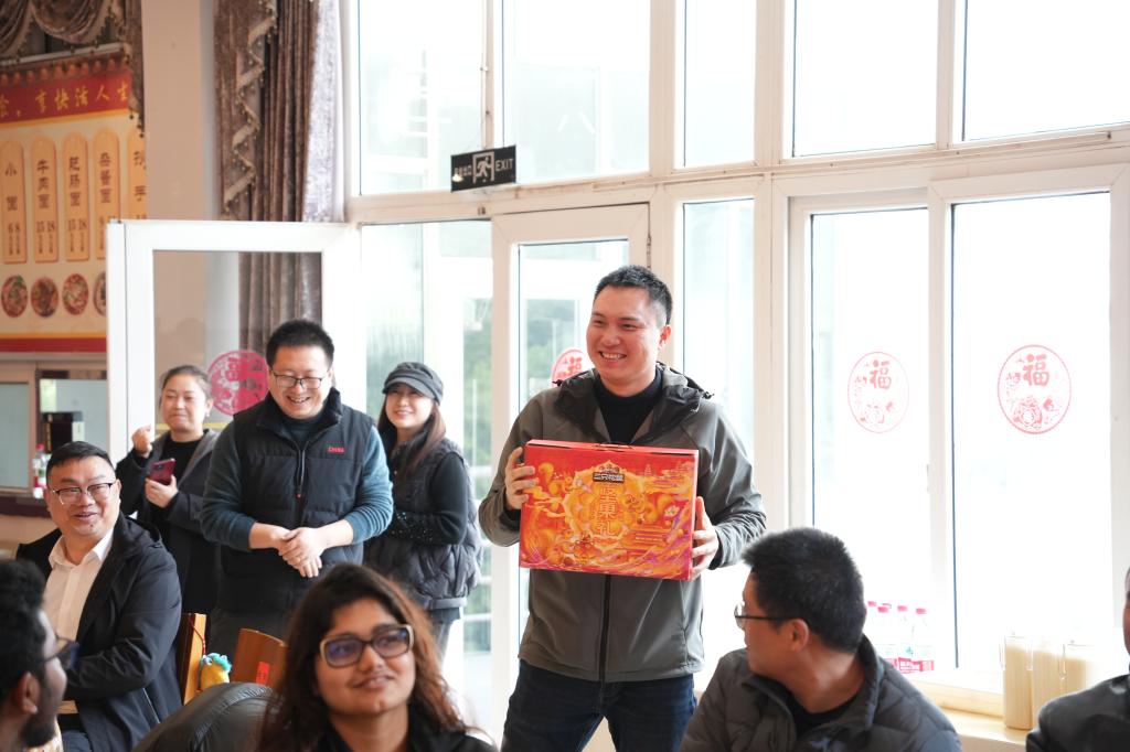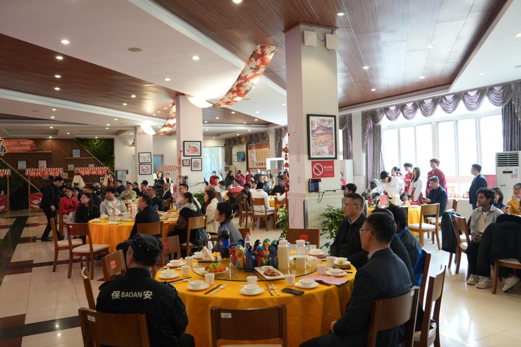 活动在暖场音乐《长江南岸七公里》《重交情天下行》中温情开启。团年饭采用桌餐形式,菜品丰富、氛围喜庆,同学们围桌而坐、举杯同庆,在欢声笑语中共享节日团圆时刻。