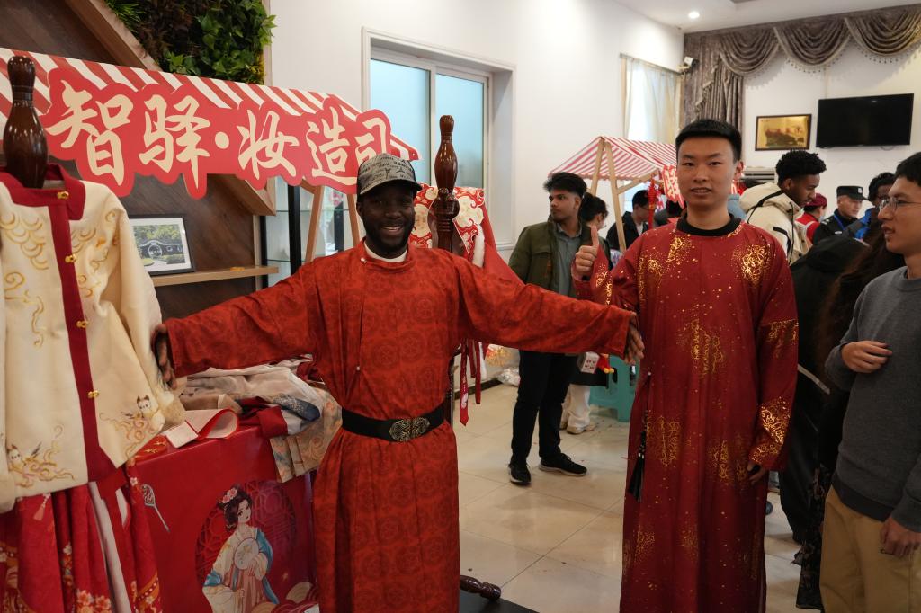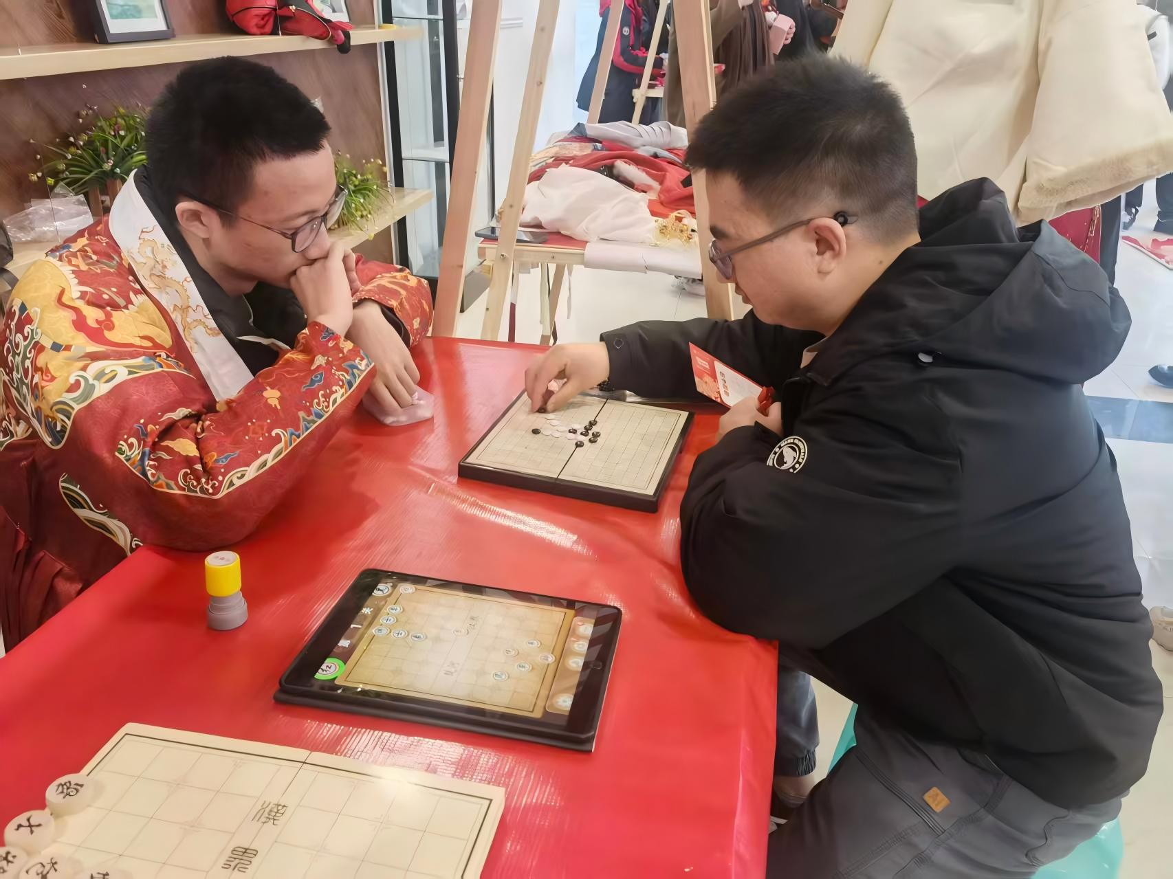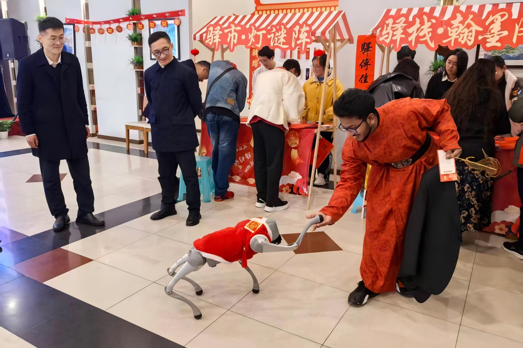 在“驿栈雅集区”(文化传承核心区),剪纸、中国结编织、画糖人等传统技艺现场呈现,非遗艺人悉心指导;书写“福”字与春联墨香四溢,围棋对弈精彩纷呈,传统甜米酿品鉴活动年味十足。同学们在沉浸式体验中触摸中华优秀传统文化的温度。在“驿市欢歌区”(互动游戏核心区),猜灯谜、套福圈等趣味活动吸引众多学生踊跃参与,欢声笑语此起彼伏,现场洋溢着青春活力与节日喜庆。在“智驿未来区”(科技打卡亮点区),汉服体验与机器人巡游展示交相辉映。机器人互动表演成为焦点,传统文化与现代科技融合呈现,为游园活动增添了创新元素与时代气息。