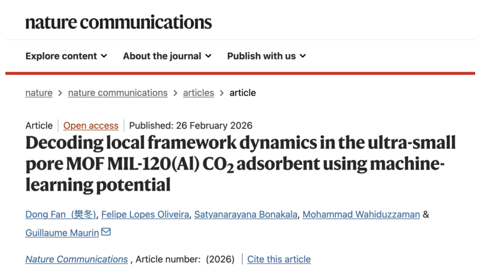 2026年2月26日,国际顶尖期刊Nature Communications在线发表了重庆交通大学材料科学与工程学院研究团队最新成果:通过将机器学习势与多尺度模拟相结合,首次系统揭示了超小孔金属有机框架(MOF)材料MIL-120(Al)中桥连羟基(μ2-OH)微观动力学如何影响CO2吸附行为。这一工作为在含湿气或复杂共存气体工况下,面向工程化应用的MOF材料高通量筛选与理性设计提供了可推广的多尺度计算框架(全文链接:https://doi.org/10.1038/s41467-026-69993-x)。本项研究以重庆交通大学为第一单位,材料学院樊冬博士为论文第一作者,通讯作者为我校引智专家Guillaume Maurin教授。