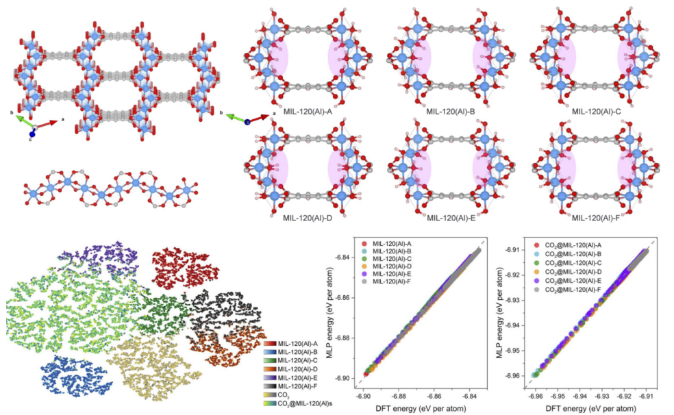 MIL-120(Al)由四价芳香族四羧酸配体与沿链边共享的AlO6八面体构建,孔径仅埃(Å)量级,兼具良好的热稳定性与抗水性,在烟道气等复杂气氛下显示出优异的CO2吸附性能。然而传统实验和计算模拟方法在描述这类超小孔、强极性体系时存在两大局限:一是实验手段难以精确定位μ2-OH等轻原子与微小取向,而这些“隐藏”的局部自由度会引发亚埃量级的孔径与电荷分布变化,从而显著改变分子吸附位点;二是常用的刚性框架模型与经验力场既难以精确捕捉μ2-OH的微观动力学行为,也难以在高度受限且极性的微环境中给出可靠的相互作用能,常出现对吸附热与吸附量的系统性高估,从而削弱预测可迁移性。