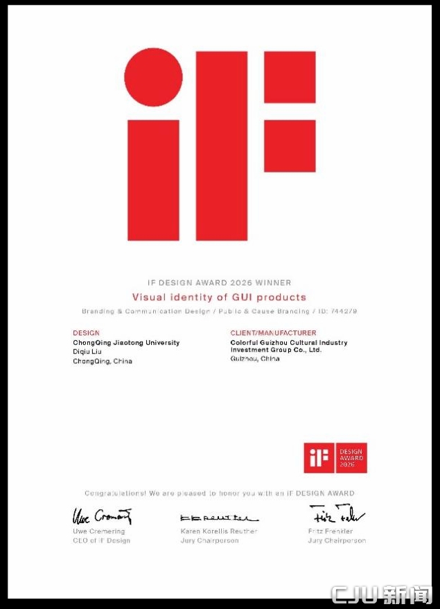近日,全球顶级设计赛事“2026年德国iF设计大奖(iF DESIGN AWARD 2026)获奖名单正式揭晓。重庆交通大学艺术设计学院刘第秋副教授设计作品,经全球129名资深评审专家严格评审、投票遴选,从来自全球68个国家和地区的10003件参赛作品中脱颖而出,成功斩获2026年德国iF设计大奖。