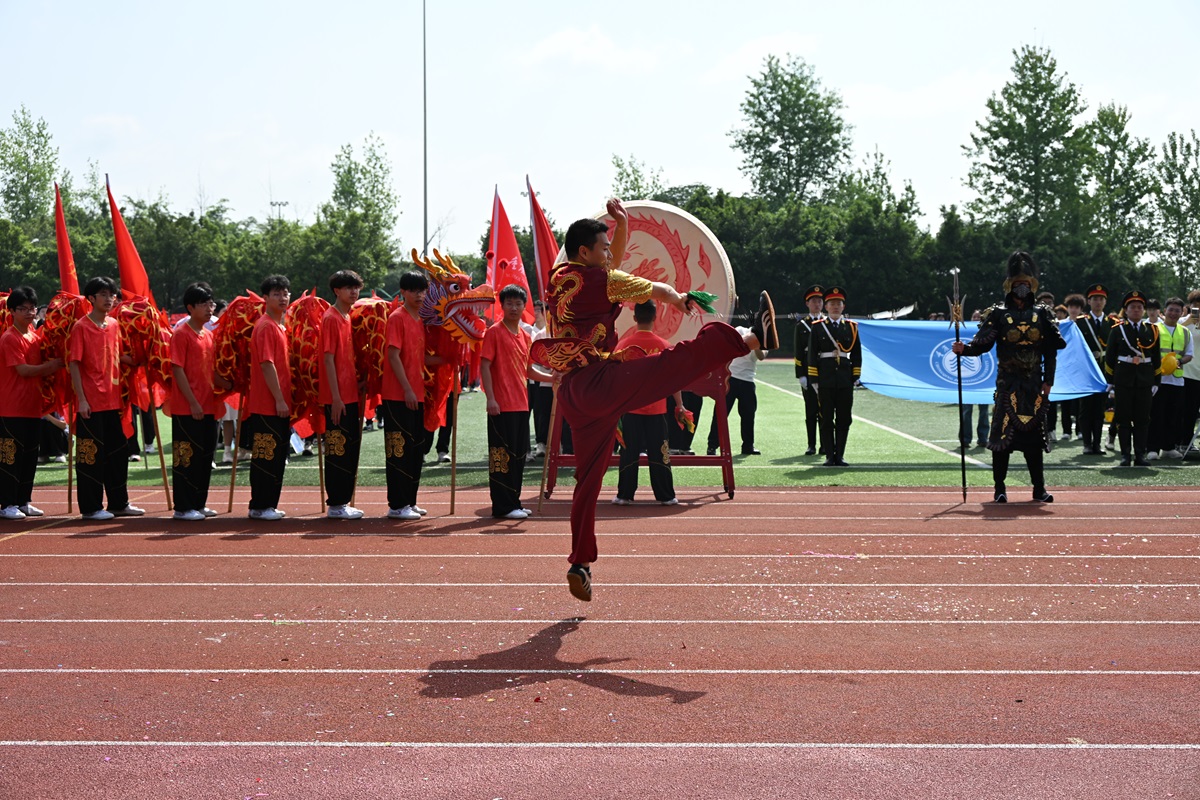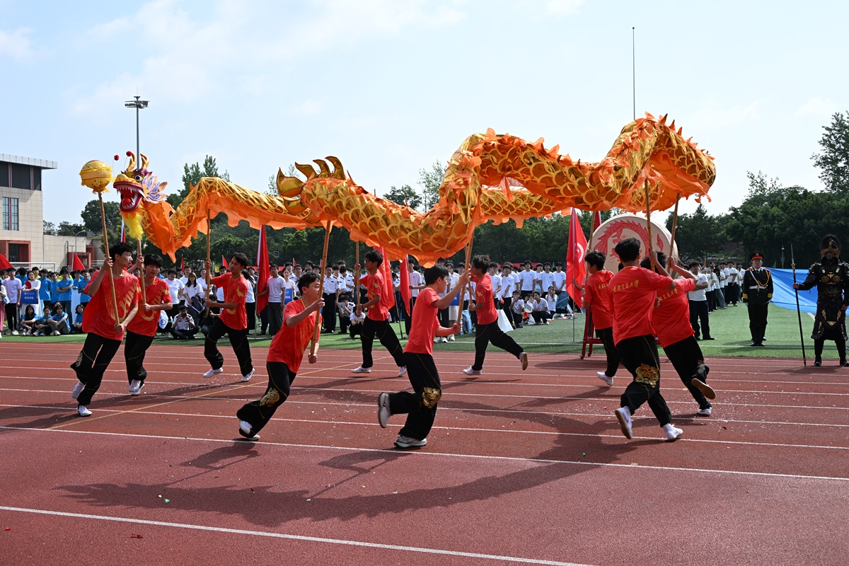 随后进行了《龙腾少年・武耀芳华》舞龙表演,并穿插九节鞭武术展示,气势恢宏,充分展现了中华体育精神与学子风采。