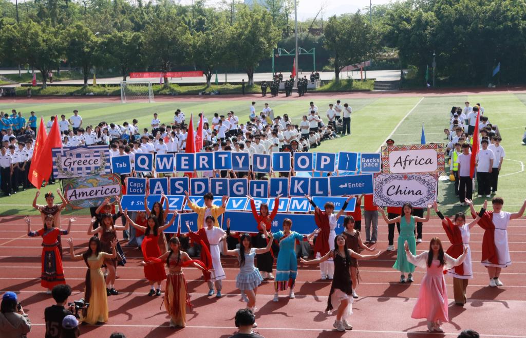 旅游与传媒学院以“文旅融合”为主题惊艳亮相。方阵入场时,师生手持“人民日报”“抖音”等媒体标识牌及话题展示,彰显了专业发展平台。学生现场扮演记者对运动会进行了采访与直播,对元宇宙、“两路”精神育人园等育人场地设施进行了讲解演示。整场展示将旅游服务与传媒技能深度融合,既体现学院“人通智至文慧天下”的理念,又展现新时代传媒学子的创新活力,成为开幕式最具传播力的亮点之一。