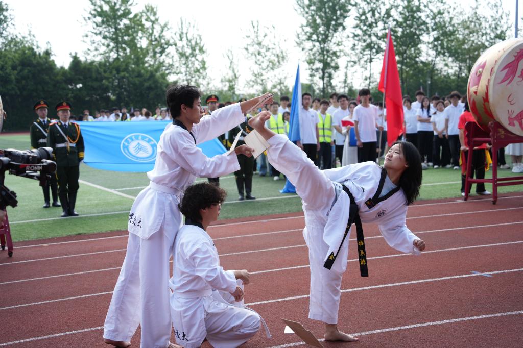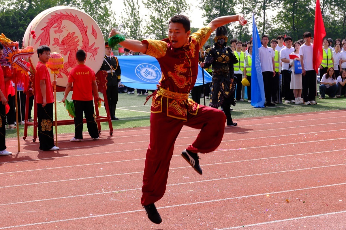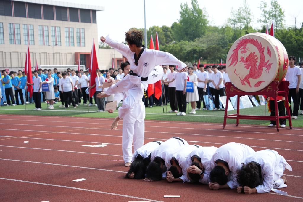 在学院方阵之后,体育代表队的精彩表演将现场气氛进一步推向高潮。跆拳道队动作刚劲有力,踢击、腾跃干净利落,尽显拼搏精神与专业素养;健美操队伴随动感音乐登场,队形流畅、节奏明快,以青春活力感染全场。随后上演的《龙腾少年·武耀芳华》舞龙表演气势恢宏,长龙翻腾、起伏有致,展现出中华传统体育的力量之美;九节鞭武术展示鞭影翻飞、刚柔并济,将现场氛围不断推向高潮,赢得阵阵掌声与喝彩。