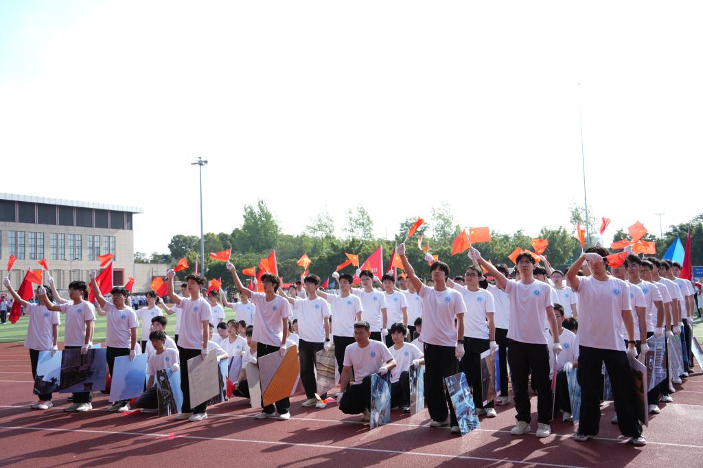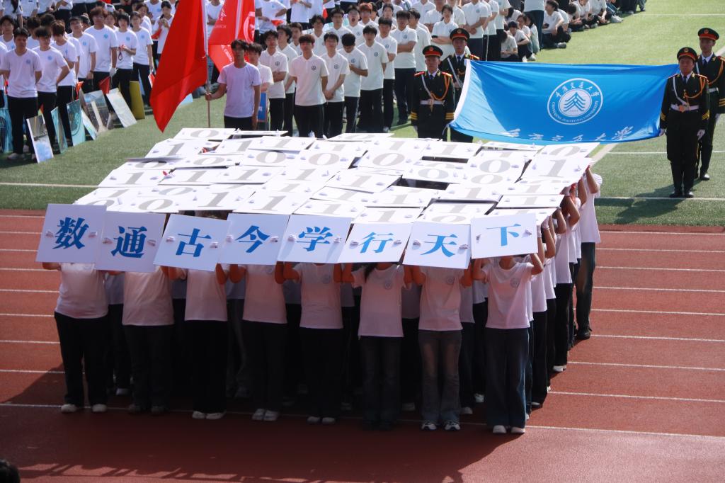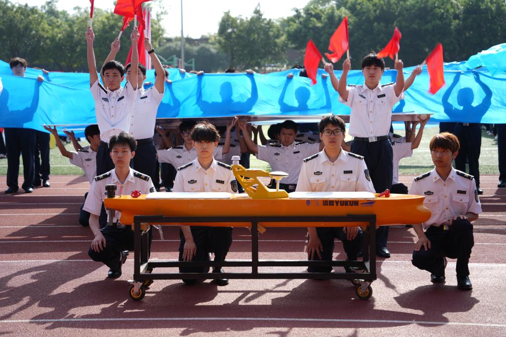 航运与船舶工程学院方阵则以整齐规范的旗语操展现专业底色。64人方阵身着统一的白色航运制服,在阳光下格外醒目。队伍步伐一致、动作统一,蓝白相间的浪带随队形起伏,如同海面波澜;红旗点缀其间,犹如航标闪耀。队伍中船模与舰船图案相互呼应,配合标准旗语动作,仿佛把航海课堂“搬”进了运动场,呈现出浓厚的海洋气息与航海风范。