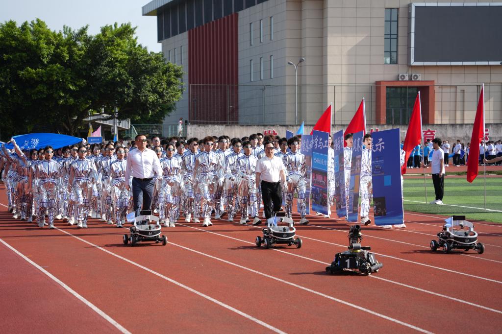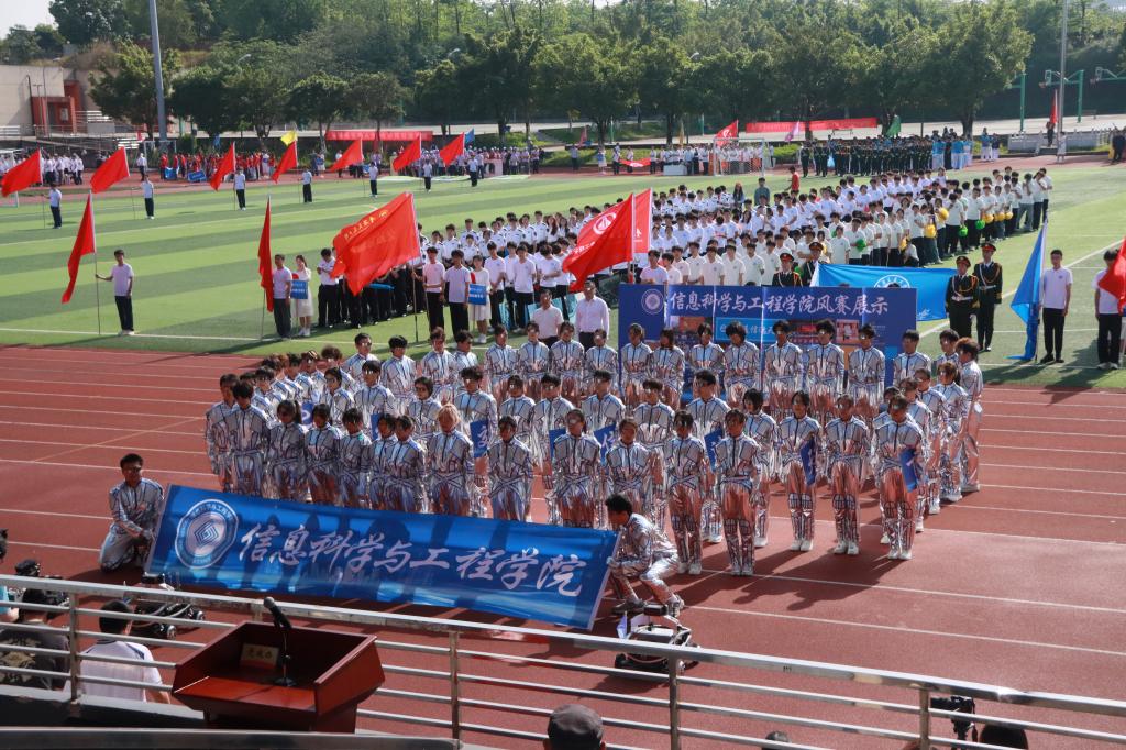 信息学院以极具科技感的入场式惊艳全场。同学们身着银色反光材质为主体,搭配蓝色线条,在阳光下折射出光泽的衣服,跟随四台智能战车前进。方阵变化时勾勒出“E”字造型,生动诠释了“E动交通、信达天下”的信念。他们通过科技元素的巧妙融入,既展现了学院在人工智能、新材料等领域的科研实力,也彰显了新时代青年学子敢于创新、追求卓越的精神品格,成为运动会亮丽的风景线之一。