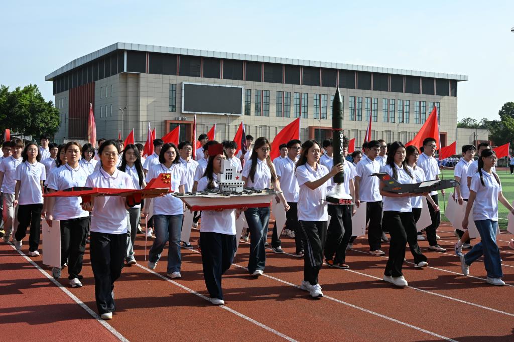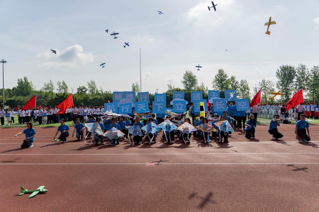 航空学院方阵围绕“逐梦蓝天”主题亮相,队伍步伐整齐、气势昂扬,展现出青年学子志在长空的精神风貌。行进展示中,一架滑翔无人机腾空而起,在运动场上空划出优美轨迹,机尾拖曳出醒目的红色烟带,如长虹贯空,与地面方阵交相呼应,瞬间点燃全场气氛。空中与地面同频共振,既展现了学院在无人机与飞行器领域的探索成果,也让“航空报国”的主题变得可视、可感,成为开幕式上一道极具冲击力的亮点画面。