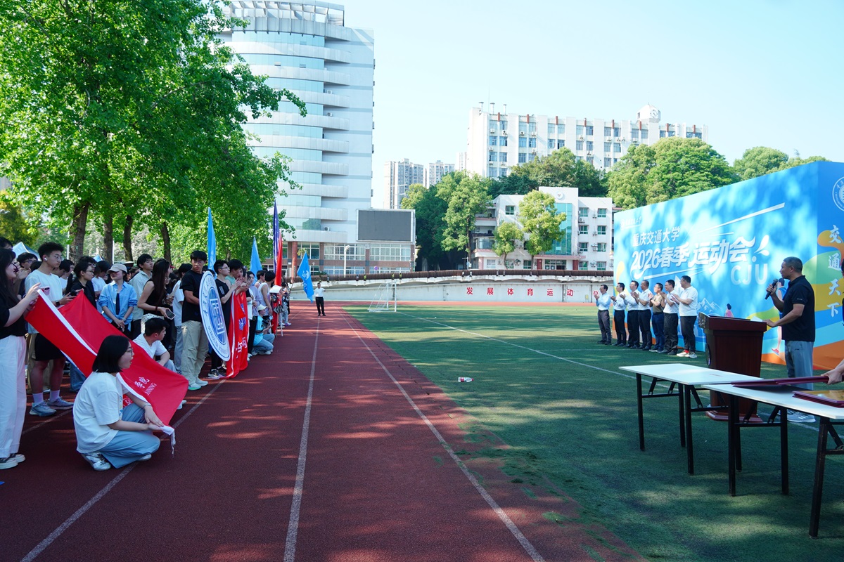 4月18日下午,重庆交通大学2026年春季运动会闭幕式在南岸校区中心运动场举行。校党委常委、副校长周建庭,党委常委、宣传部部长叶勇出席闭幕式,体育部、学生处、校团委等职能部门及各学院负责人与全体运动员共同见证了这场为期两天的青春盛会圆满落幕。