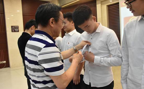 全体成员宣读入团誓词后,刘剑鸣老师、李洪波老师、向巍老师、苗国厚老师分别为新团员佩戴团徽。