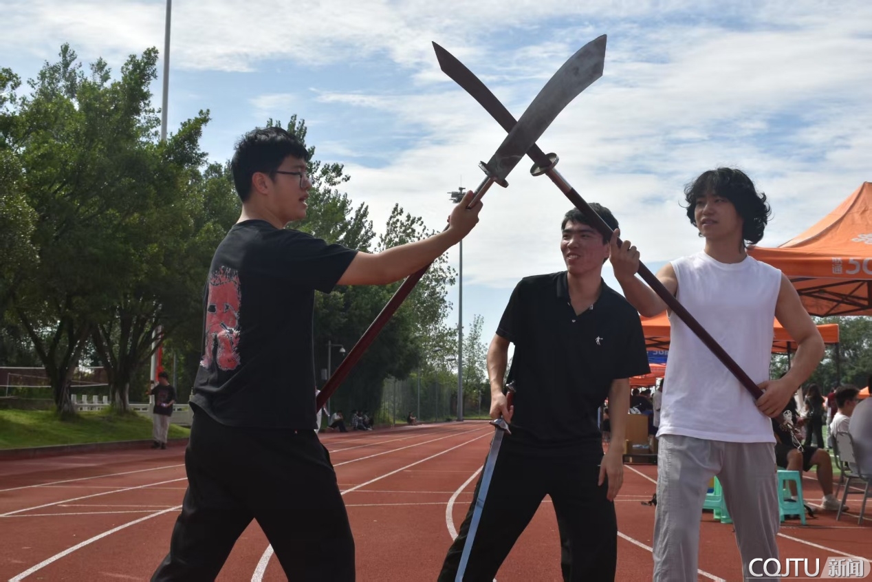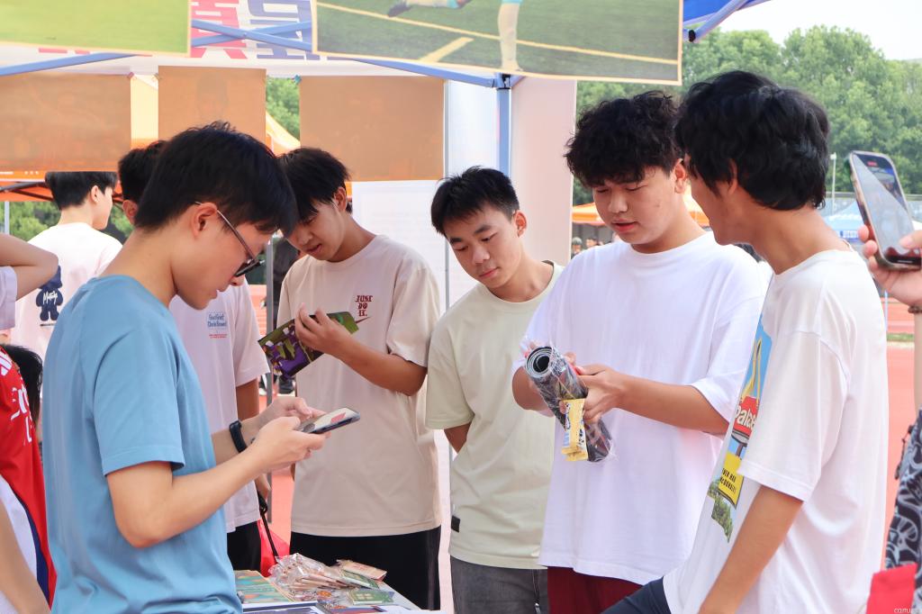 舞台两侧及运动场周边的招新展位同样热闹非凡,各社团“十八般武艺”齐上阵,吸引着过往同学驻足咨询。武术协会成员在田径场上精彩对练,刀刃交击尽显武术功底,引得同学们纷纷用手机记录这震撼瞬间。同萌会动漫社的成员们细心为感兴趣的同学介绍并合影互动,摊位上的手办与漫画周边更是让动漫爱好者们流连忘返。每个展位前都人头攒动,社团成员们积极发放宣传单、解答疑问,同学们则穿梭其间,寻找属于自己的“兴趣归属”。