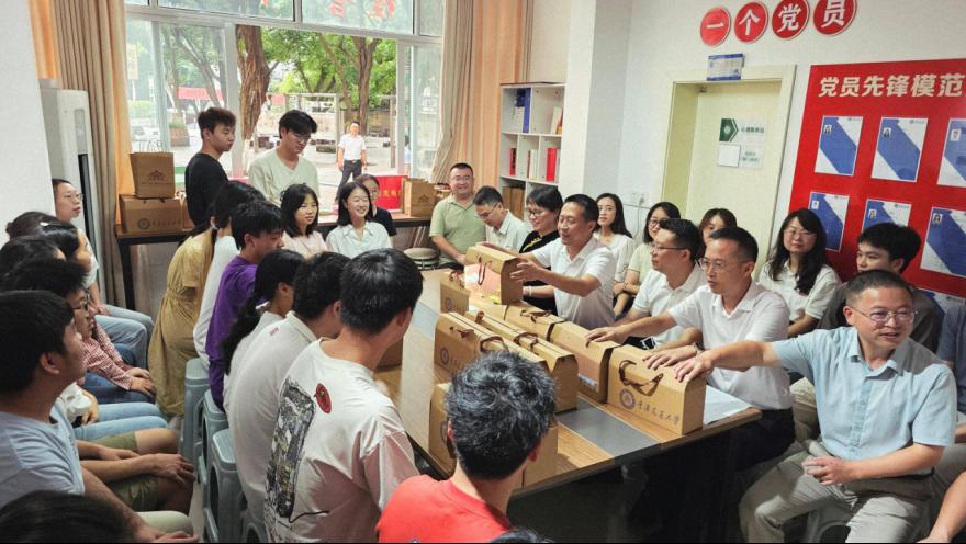 慰问环节,与会老师将饱含学校深情的中秋月饼一一送到同学们手中。月饼包装上“传承‘两路’精神、力行交通报国”的字样熠熠生辉,寄托着学校对同学们的殷切期望与美好祝愿。