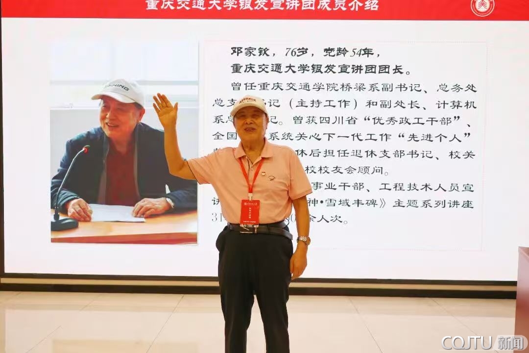 宣讲会上,邓家钦团长首先介绍了我校宣讲团情况:“作为‘两路’精神的活化石,我们这些老交通人虽已银发苍苍,但传承使命永不褪色!”。邓家钦作了题为《发扬“两路”精神 甘当铺路石》的专题报告,深入阐释了“两路”精神的内涵要义、重庆交通大学与“两路”精神的历史渊源,以及交大人以“叫高山低头,让河水让路”的精神气魄身体力行,生动诠释了“一不怕苦、二不怕死,顽强拼搏、甘当路石”的精神。
