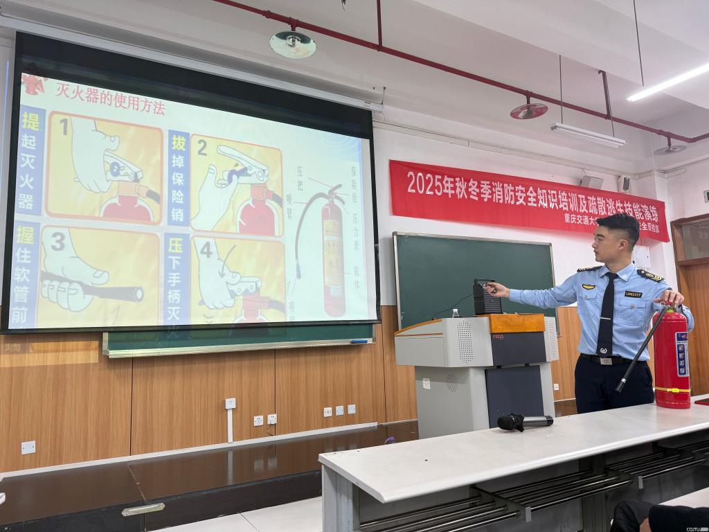 为深入贯彻市教委《关于进一步加强学校消防安全工作的通知》精神,结合11.9消防日来临之际,积极响应第34个全国消防月“全民消防,生命至上——安全用火用电”的号召,11月5日,后勤服务中心特邀重庆鑫利民防火宣传培训中心彭文俊教官,于南岸校区三教30304教室举办2025年秋冬季消防安全知识培训及疏散逃生技能演练。后勤物业、餐饮及校园各门面商户代表共约180人参与此次培训。活动采用“理论授课 + 实操演练 + 案例警示”的立体化模式,全面提升后勤员工消防安全应急处置能力,为校园消防安全筑牢坚实防线。