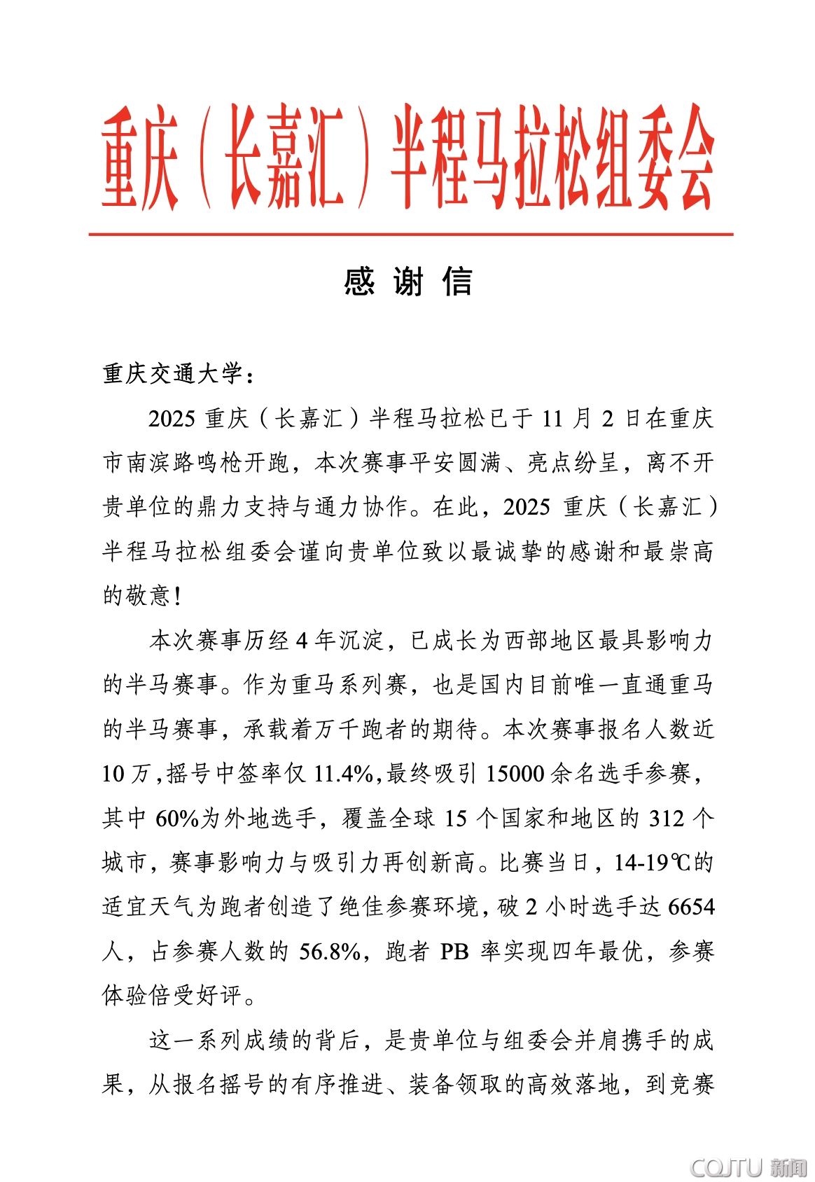组委会《感谢信》指出,赛事志愿者们在赛事中的付出,是跑者安心奔跑的底气,是赛事圆满落幕的基石。无论是赛前还是赛后,随处可见志愿者们辛勤服务的身影,你们的微笑与热情,让选手感受到了“重小马”的温暖,成为赛道上一道靓丽的风景,体现了重庆交通大学同学们的专业素养与责任担当,也让“长嘉汇半马”的品牌印记更加深刻。