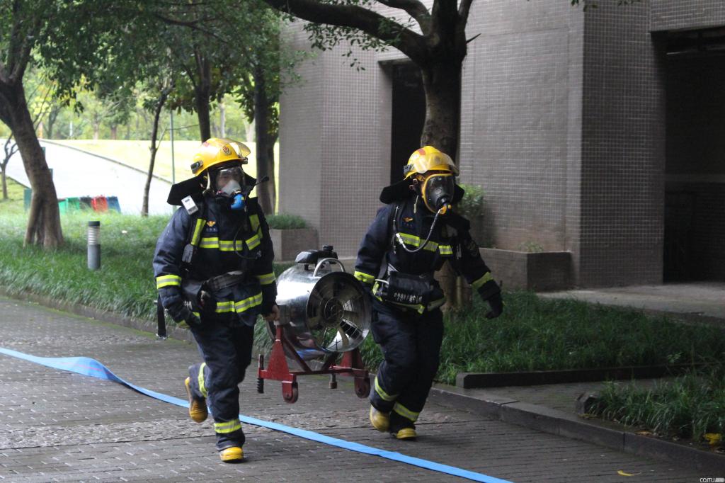 王鹤宣布演练正式开始后安保人员在宿舍内释放烟雾。按演练程序,学生发现德园小区3栋宿舍出现“火情”,立即向宿舍管理员报告;宿舍管理员随即拨打消防控制室火警电话,汇报着火位置、火势大小、燃烧物质等相关情况。楼内各疏散楼梯口等重点区域的引导员迅速就位,引导学生使用湿毛巾捂住口鼻,弯腰低头沿疏散指标所示方向有序撤离。同时消防控制室值班人员立即联系灭火行动组并拨打火警电话,呼叫消防队。在学校工作人员和消防救援人员的共同努力下,迅速扑灭了“火苗”。