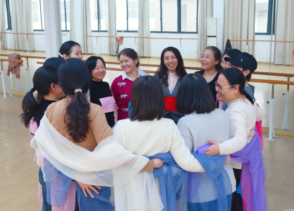 轻快的律动唤醒久违的轻盈,刘老师将老师们两两组队,围绕“最喜欢”与“不满意”的身体部位自编舞蹈并分组展示。有的小组化身花蝴蝶翩翩起舞,有的小组借助新疆舞动作展现如玫瑰般绽放的生命力。大家通过优美的舞蹈表达对身体部位的喜爱,每位老师都表示通过课程引导,没有不满意的身体部分,大家在舞动中实现与自我的深度和解。活动尾声,大家分享着“在舞动中找回了松弛感”“原来身体比我更懂自己的情绪”的真切体验,现场满是舒展的笑容。