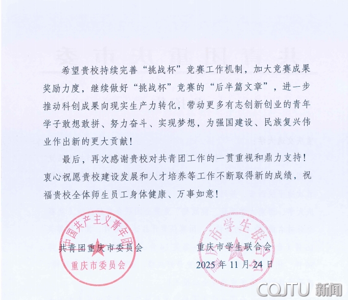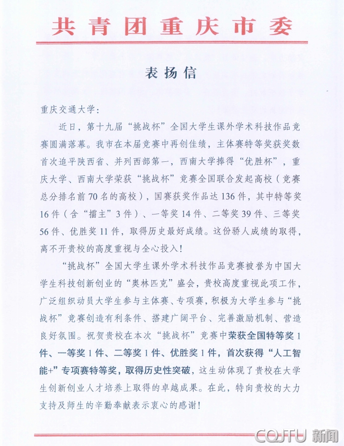 近日,共青团重庆市委、重庆市学联向重庆交通大学发来表扬信,对我校在组织师生参加第十九届“挑战杯”全国大学生课外学术科技作品竞赛工作中取得的突出成绩和做出的积极贡献表示高度肯定和赞扬。