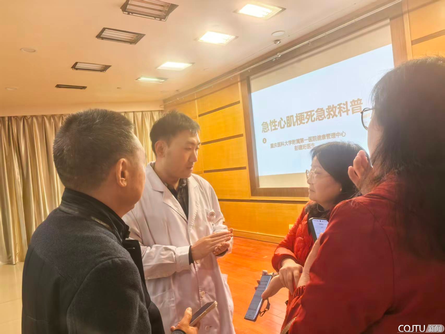 本次讲座嘉宾重庆医科大学附属第一医院健康管理中心彭建珩博士,深耕心血管疾病健康管理多年,经验十分丰富。彭博士聚焦急性心肌梗死,从病因相关性疾病切入,普及了急性心肌梗死定义、危险因素、典型及非典型症状识别、急救措施、日常健康管理、救治误区等六个方面的知识。讲座中彭博士特别强调了急性心肌梗死“黄金120分钟”的重要性。