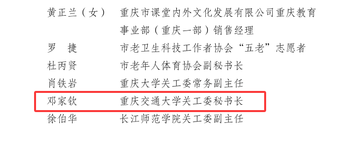 近日,市人力社保局、市关工委、市委文明办联合发文表彰关心下一代工作先进集体和先进个人。本次共表彰50个先进集体和100名先进个人,重庆交通大学关工委秘书长邓家钦同志立足本职岗位,守正创新、锐意进取,倾情倾力服务青年健康成长,荣获“重庆市关心下一代工作先进个人”荣誉称号。