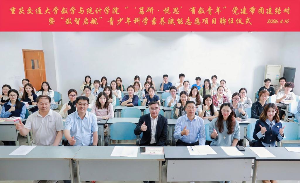 4月10日下午,重庆交通大学数学与统计学院在科学城校区隆重举行“‘笃研·悦思’有‘数’青年”党建带团建赋能共进结对暨“数智启航”青少年科学素养赋能志愿项目聘任仪式。此次活动作为第六届数学文化节的核心环节,恰逢学校建校75周年与“团队建设年”,其“党建引领、团队协作”的内核与学校正在开展的“七十五载·团队致远”主题教育活动形成呼应,标志着学校在基础学科人才培养与党建思政工作深度融合方面取得实质性进展。