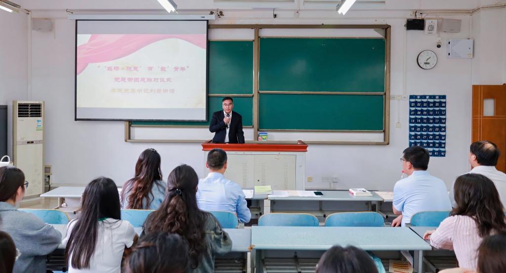 活动现场,学院党委紧扣育人实效,创新实施“3+1”党团共建机制,遴选三名学生党员骨干精准对接学生团支部,通过签署“赋能共进卡”、赠送专业书籍等形式,构建“思想领航、学业帮扶、实践指导”的全链条培养体系。学院党委书记刘君在讲话中强调,要充分发挥基层党组织战斗堡垒作用和党员先锋模范作用,引导学生将个人成长融入学校建校75周年的奋进征程与“双一流”创建大局,让党旗在学科高地高高飘扬,实现组织优势向育人效能的深度转化,切实呼应“每个人都是CJU的力量”的主人翁号召。