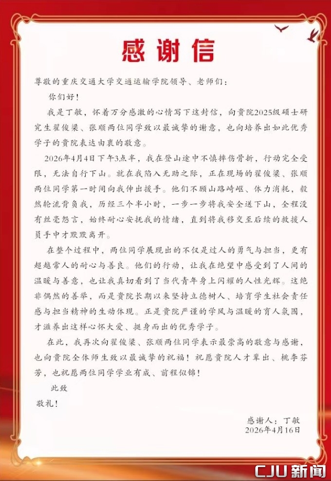 2026年4月4日下午3时30分,丁敏女士大圆洞徒步途中不慎摔伤骨折,行动完全受限,被困山间无法自行下山,处境危急。就在伤者陷入孤立无援之际,恰好路过此处的重庆交通大学交通运输学院2025级硕士研究生翟俊梁、张顺第一时间发现险情,毫不犹豫地伸出援手。面对崎岖陡峭的山路、持续消耗的体力,两名同学没有丝毫犹豫与退缩,毅然决定轮流背负受伤人员下山。一路上,他们相互配合、稳步前行,历经三个半小时的艰难跋涉,一步一步将伤者安全护送至山下安全区域。全程中,二人耐心安抚伤者情绪,悉心照料、毫无怨言,直至将伤者顺利移交后续救援人员后,才默默离开现场。