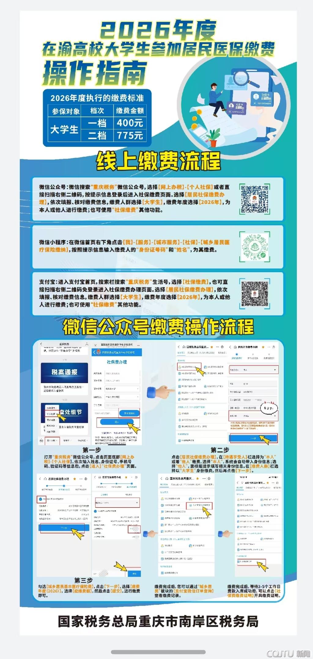 根据重庆市医疗保障局、重庆市财政局、国家税务总局重庆市税务局联合发布的《关于做好2025年城乡居民基本医疗保障工作的通知》渝医保发〔2025〕42号文件精神,为进一步做好我校学生的医疗保障工作,现将2026年大学生参保政策解读如下: