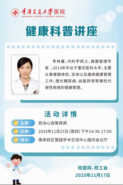 你是否察觉,在看似波澜不惊的日常生活中,潜藏着一个可能瞬间击碎幸福的“健康刺客”——心血管疾病。它已经成为威胁国民健康的“头号杀手”。根据2024年欧洲心脏病学年会上公布的最新统计数据,心血管疾病导致的死亡人数在2021年超过了300万。而猝死、心肌梗死这两种急症,更是这个“刺客”最凶狠的招式:可能前一刻还在和同事讨论工作,下一秒就因剧烈胸痛倒在办公桌前;或许刚陪父母逛完菜场,转身就因突发不适失去意识,它正悄然地威胁着每一个忽视健康的人。为进一步普及心血管疾病防治知识,增强我校师生的健康意识,校医院联合校工会特邀请重医附一院健康管理专家李林蔓医师,组织开展《防治心血管疾病》健康科普讲座,在这里,没有晦涩难懂的术语,只有通俗易懂、实用有效的防治知识;不仅能助你树立科学的健康观念,还会悉心教你预防技巧、识别早期症状、掌握康复要点,让你真正成为自己和家人的“健康守护者”,稳稳握住健康管理的主动权。现诚邀你的参与,一起为心血管健康筑起坚固防线!讲座尾声设置互动答疑环节,嘉宾将现场解答大家的健康疑问。