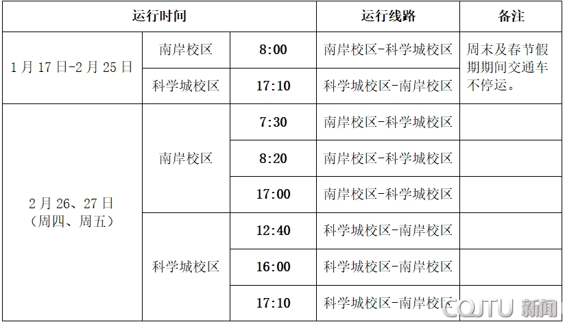 根据学校2026年寒假及春季学期开学工作安排,为方便师生员工假期双校区工作学习,现将寒假前后及春季学期学生行课前交通车运行安排如下: