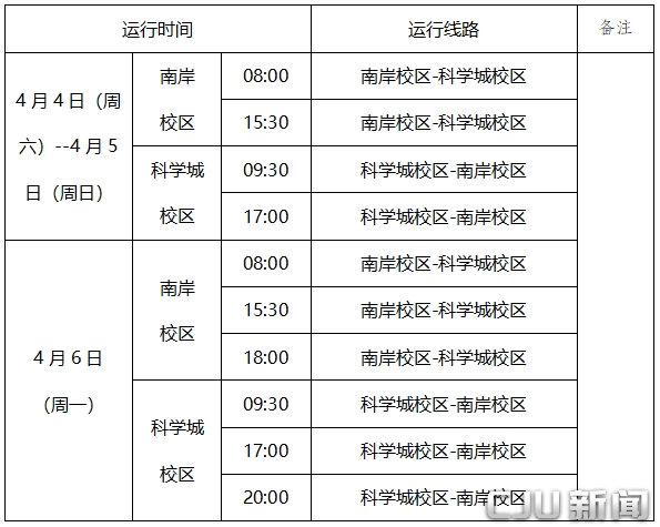 根据学校放假时间安排,2026年“清明节”假期双校区交通车运行时间及线路如下: